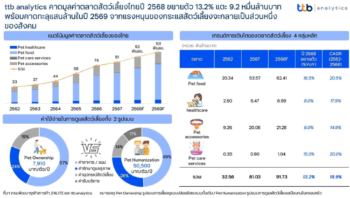1 min read การเงิน-การลงทุน ttb analytics คาดมูลค่าตลาดสัตว์เลี้ยงไทยปี 2568 ขยายตัว 13.2% แตะ 9.2 หมื่นล้านบาท 3 กรกฎาคม 2025 admin