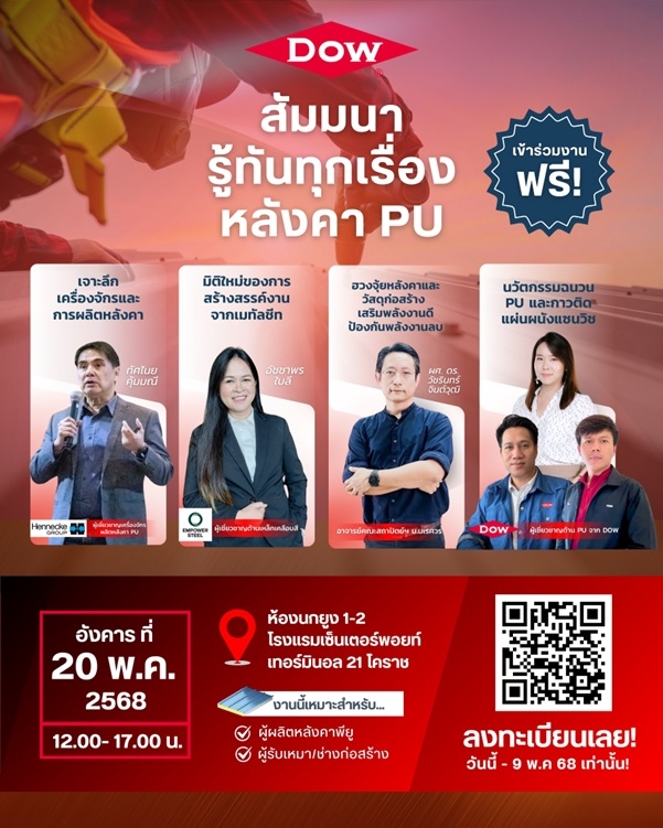 กลุ่มบริษัท ดาว ประเทศไทย (Dow) ได้เตรียมสัมมนา ในหัวข้อ “รู้ทันทุกเรื่องหลังคาพียู”โดยรวมผู้เชี่ยวชาญหลากหลายด้านในวงการก่อสร้างมาให้ความรู้เกี่ยวกับนวัตกรรมวัสดุฉนวน PU สำหรับหลังคาเมทัลชีท การผลิตหลังคาที่ปลอดภัยและได้คุณภาพ เทคนิคการติดตั้งหลังคาอย่างปลอดภัย และแนวทางการสร้างบ้านให้อยู่เย็นเป็นสุขตามหลักฮวงจุ้ย โดยจัดขึ้นในวันอังคารที่ 20 พฤษภาคม 2568 เวลา 12.00-17.00 น. ณ โรงแรมเซ็นเตอร์พอยท์ เทอร์มินอล 21 โคราช จ.นครราชสีมา สำหรับผู้ที่สนใจ ทั้งในกลุ่มผู้ผลิตหลังคาเมทัลชีทพียู ผู้รับเหมา และช่างก่อสร้าง สามารถเข้าร่วมงานสัมมนาฟรี ลงทะเบียนเข้าร่วมงานโดยไม่เสียค่าใช้จ่ายได้ที่ https://engage.dow.com/LP=14024 ตั้งแต่วันนี้จนถึงวันที่ 9 พฤษภาคม 2568 สอบถามเพิ่มเติมได้ที่ Facebook: Dow Thailand