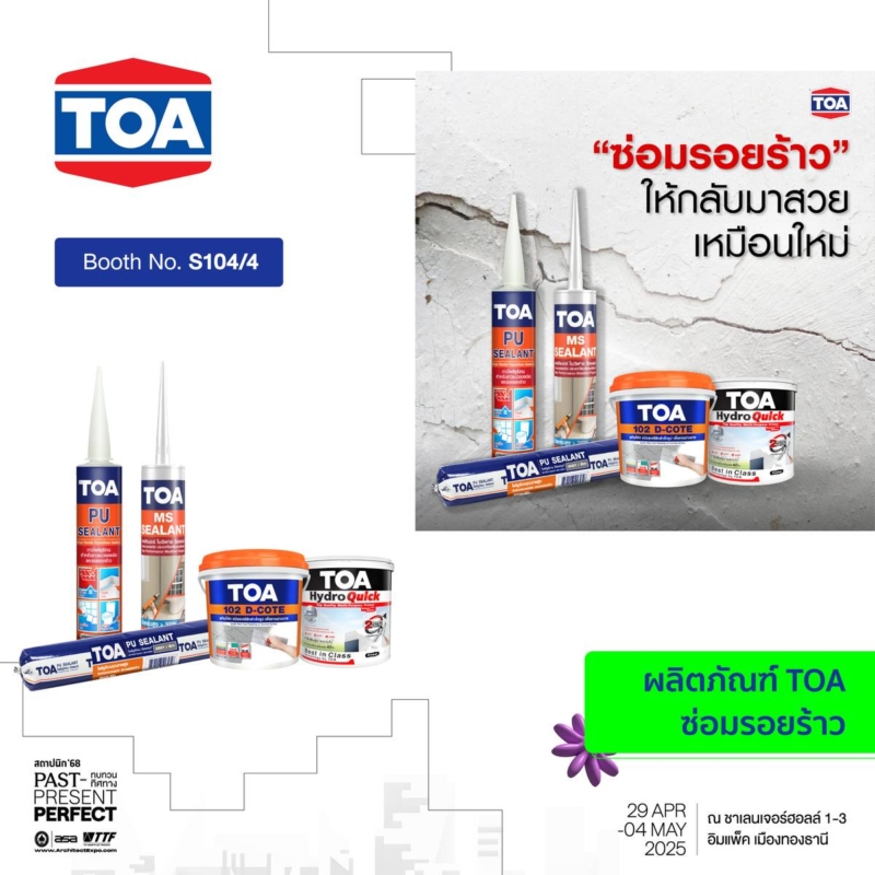 นอกจากนี้ ยังมีผลิตภัณฑ์สีที่ตอบโจทย์ทุกพื้นผิวการใช้งาน ไม่ว่าจะเป็นสีทาผนังอาคาร เช่น สีซุปเปอร์ชิลด์ ทนทานนาน 20 ปี สีงานไม้ สีงานเหล็ก สีอุตสาหกรรม สีตกแต่งพิเศษ และผลิตภัณฑ์กลุ่ม Insecticide – ป้องกันและกำจัดปลวก มอด มด แมลง “เชนไดร้ท์ – Chaindrite” ยอดขายอันดับ 1 ที่เชื่อถือมายาวนานกว่า 50 ปี โดยที่เป็นตัวแทนจำหน่ายจากบริษัทเชลล์แห่งประเทศไทยมาตั้งแต่ปี พ.ศ. 2522 หากคุณกำลังมองหาวิธีซ่อมแซมบ้านให้แข็งแรง ปลอดภัย พร้อมรับมือฤดูฝนที่กำลังจะมาถึง TOA มีครบ จบทุกปัญหารอยแตกร้าว สามารถดาวน์โหลด คู่มือซ่อมแซมหลังแผ่นดินไหว ได้ฟรี ที่ toa-earthquake-repair-handbook.pdf สอบถามข้อมูลเพิ่มเติมที่ TOA Call Center โทร. 02-335-7777 กด 1 พร้อมพบกับนวัตกรรมซ่อมแซมบ้านหลังแผ่นดินไหว ด้วยเคมีภัณฑ์ก่อสร้างครบวงจรแบบ Total Solution ได้ที่บูธ TOA : หมายเลข S104/4 ในงานสถาปนิก ’68 ระหว่างวันที่ 29 เม.ย. – 4 พ.ค. 2568 ณ อิมแพค ชาเลนเจอร์ฮอลล์ เมืองทองธานี
