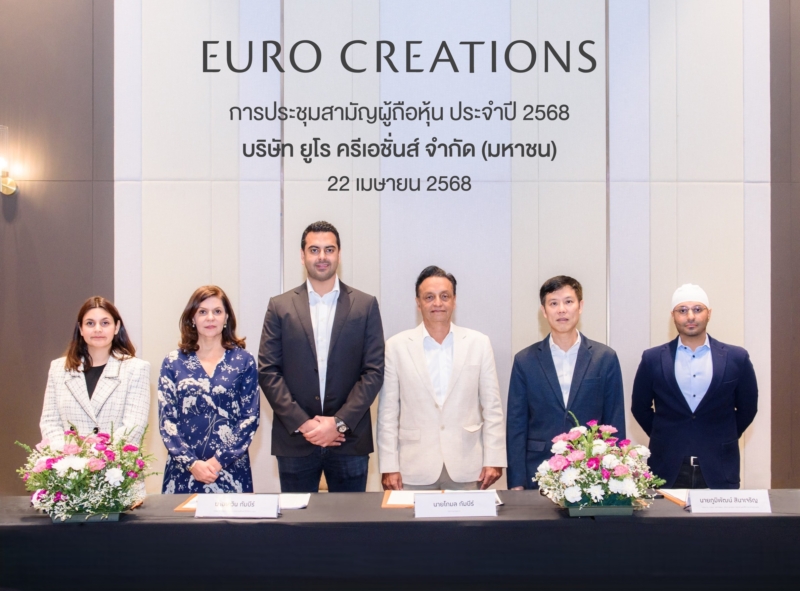 คุณโกมล กัมบีร์ (ที่ 3 จากขวา) ประธานกรรมการบริษัท และคุณเควิน กัมบีร์ (ที่ 3 จากซ้าย) ประธานเจ้าหน้าที่บริหาร พร้อมด้วยคณะกรรมการและผู้บริหาร บริษัท ยูโร ครีเอชั่นส์ จำกัด (มหาชน) (EURO) ถ่ายภาพร่วมกันภายหลังการประชุมสามัญผู้ถือหุ้นประจำปี 2568 ในรูปแบบการประชุมผ่านสื่ออิเล็กทรอนิกส์ (e-AGM) ถ่ายทอดสดจากห้อง Cotton Room ชั้น 7 โรงแรม Avani Sukhumvit Bangkok โดยที่ประชุมมีมติเห็นชอบทุกวาระตามที่คณะกรรมการเสนอ รวมทั้งอนุมัติจ่ายเงินปันผลจากผลการดำเนินงานปี 2567 ในอัตราหุ้นละ 0.22 บาท กำหนดจ่ายเงินในวันที่ 20 พฤษภาคม 2568 ซึ่งกิจกรรมดังกล่าวจัดขึ้นเมื่อเร็วๆ นี้