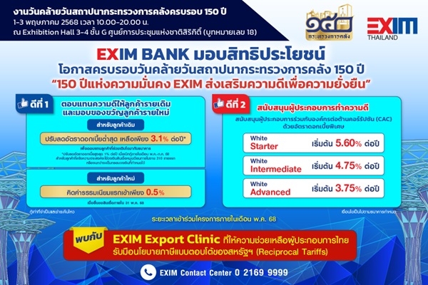 ธนาคารเพื่อการส่งออกและนำเข้าแห่งประเทศไทย (EXIM BANK) จัดเต็ม บริการทางการเงิน พร้อมโปรโมชันพิเศษ ตอบแทนความดีของผู้ประกอบการไทยในธุรกิจที่เกี่ยวเนื่องกับการส่งออก ในงาน “MOF Journey 150 ปี เส้นทางการคลังไทย” โอกาสวันคล้ายวันสถาปนากระทรวงการคลัง ครบรอบ 150 ปี ระหว่างวันพฤหัสบดีที่ 1-วันเสาร์ที่ 3 พฤษภาคม 2568 ณ Hall 3-4 ศูนย์การประชุมแห่งชาติสิริกิติ์ หมายเลขบูท 18 ภายใต้แนวคิด “150 ปีแห่งความมั่นคง EXIM ส่งเสริมความดีเพื่อความยั่งยืน”
