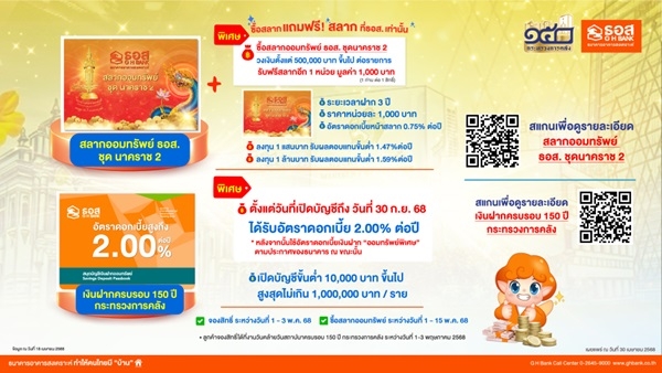 ธนาคารอาคารสงเคราะห์ (ธอส.) ร่วมออกบูธในงานวันสถาปนากระทรวงการคลัง ครบรอบ 150 ปี ระหว่างวันที่ 1 – 3 พฤษภาคม 2568 ณ ศูนย์การประชุมแห่งชาติสิริกิติ์ เวลา 10.00 – 20.00 น. โดยพร้อมเป็นส่วนหนึ่งในการส่งเสริม การออมของประชาชน กับสลากออมทรัพย์ ธอส. ชุดนาคราช 2 หน่วยละ 1,000 บาท อายุสลาก 3 ปี ผลตอบแทน หน้าสลาก 0.75% ต่อปี ลงทุนเพียง 1 แสนบาท รับผลตอบแทนขั้นต่ำ 1.47%ต่อปี และหากลงทุน 1 ล้านบาท รับผลตอบแทน ขั้นต่ำ 1.59% ต่อปี โดยมีรางวัลที่ 1 มูลค่ารางวัล 3 ล้านบาท ต่อหมวด พร้อมรางวัลอีกมากมายทุกเดือน รวม 36 ครั้ง พิเศษ! ผู้ที่ซื้อสลากวงเงินตั้งแต่ 500,000 บาท ขึ้นไปต่อรายการ รับฟรีสลากออมทรัพย์ ธอส. ชุดนาคราช 2 จำนวน 1 หน่วย มูลค่า 1,000 บาท จำนวน 1 ท่านต่อ 1 สิทธิ์ (เงื่อนไขเป็นไปตามที่ธนาคารกำหนด) และเงินฝากครบรอบ 150 ปี กระทรวงการคลัง ได้รับอัตราดอกเบี้ยสูงถึง 2.00% ต่อปี ตั้งแต่วันที่เปิดบัญชีถึงวันที่ 30 กันยายน 2568 โดยเปิดบัญชีขั้นต่ำ 10,000 บาทขึ้นไป สูงสุดไม่เกิน 1 ล้านบาทต่อราย โดยผู้ที่สนใจซื้อสลากออมทรัพย์ ธอส. ชุดนาคราช 2 และเปิดบัญชีเงินฝากครบรอบ 150 ปี กระทรวงการคลัง สามารถจองสิทธิ์ภายในงาน และซื้อสลากออมทรัพย์ หรือเปิดบัญชีเงินฝากได้ที่สาขา ธนาคารตั้งแต่วันที่ 1 – 15 พฤษภาคม 2568 โดยสอบถามรายละเอียดเพิ่มเติมได้ที่ ธอส. ทุกสาขาทั่วประเทศ หรือ G H Bank Call Center โทร.02645-9000 หรือ Facebook Fanpage ธนาคารอาคารสงเคราะห์ ติดตามข่าวสารของธนาคารได้ที่ Application : GHB ALL GEN และ www.ghbank.co.th