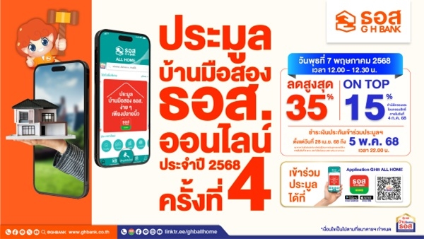 สำหรับลูกค้าที่ชนะการประมูลสามารถใช้โปรโมชันผลิตภัณฑ์ “สินเชื่อสำหรับซื้อทรัพย์ NPA พร้อมขายของธนาคาร” ที่จะได้รับอัตราดอกเบี้ยต่ำสุด นานสูงสุด 24 เดือน และหากทำนิติกรรมและโอนกรรมสิทธิ์ ภายในวันที่ 4 กรกฎาคม 2568 จะได้รับส่วนลด On Top เพิ่มอีก 15% ด้วย โดยผู้ที่สนใจสามารถดูทรัพย์จริง หรือรับชมภาพทรัพย์ก่อนเข้าร่วมประมูล ได้ทาง Application : GHB ALL HOME หรือ www.ghbhomecenter.com และลงทะเบียนชำระเงินประกันเข้าร่วมประมูลออนไลน์ได้ตั้งแต่วันนี้ถึงวันที่ 5 พฤษภาคม 2568 เวลา 22.00 น. รายการละ 10,000 บาท โดยสามารถดาวน์โหลด Application : GHB ALL HOME ผ่านระบบ iOS หรือ Android เพื่อลงทะเบียนการใช้งาน จากนั้นเลือกเมนู “ประมูลทรัพย์ Online” และเลือกทรัพย์ที่ต้องการ ก่อนชำระเงินประกันผ่านทาง Application : GHB ALL GEN หรือ QR Code ก่อนเข้าร่วมประมูลและเสนอราคาในงานต่อไป โดยสอบถามข้อมูลเพิ่มเติมได้ที่ G H Bank Call Center โทร.0-2645-9000 กด 5 หรือ Facebook Fanpage บ้านมือสอง ธอส. หรือดูข้อมูลบ้านมือสอง ธอส. ได้ที่ www.ghbhomecenter.com, Mobile Application : GHB ALL HOME และ Line Official Account : @GHBALLHOME