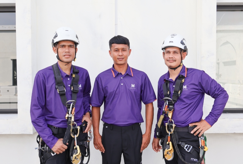 การโรยตัวลงจากตึกสูงไม่ใช่เรื่องของความท้าท้ายและความกล้าหาญเท่านั้น แต่เป็นการทำงานที่ต้องการความรับผิดชอบสูง ซึ่ง Metthier ให้ความสำคัญกับเรื่องนี้เป็นอันดับหนึ่ง ก่อนเริ่มงานทุกวัน เราต้องตรวจเช็คอุปกรณ์ทุกชิ้นอย่างละเอียด ตั้งแต่สายรัด หมวกนิรภัย ถุงมือ และเชือกทุกเส้น นายสมบัติอธิบายถึงขั้นตอนก่อนเริ่มงาน บริษัทมีข้อกำหนดชัดเจนเรื่องชั่วโมงการใช้งานอุปกรณ์ หากครบกำหนดจะเปลี่ยนใหม่ทันที ไม่มีการประนีประนอมในเรื่องความปลอดภัย นอกจากอุปกรณ์ที่ได้มาตรฐานแล้ว การทำงานที่สูงที่ Metthier ยังมีผู้เชี่ยวชาญคอยกำกับดูแลการทำงานตลอดเวลา พร้อมเจ้าหน้าที่ความปลอดภัยในการทำงาน (จป.) ทั้งในระดับหัวหน้างานและระดับวิชาชีพ ช่วยเสริมความมั่นใจให้กับทีมงาน “นี่คือสิ่งที่ทำให้ครอบครัวผมหายห่วง แม้จะรู้ว่างานที่เราทำมีความเสี่ยง” นายสมบัติกล่าวด้วยน้ำเสียงมั่นใจ
