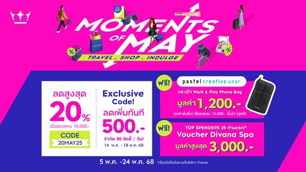 คิง เพาเวอร์ ออนไลน์ จัดแคมเปญ “MOMENTS OF MAY : TRAVEL . SHOP. INDULGE” เมื่อช้อปครบ 10,000 บาทขึ้นไป รับส่วนลดสูงสุด 20% เพียงใส่รหัส 20MAY25 และรับเพิ่มกระเป๋า PASTEL CREATIVE WEAR Work & Play Phone 1 ใบ มูลค่า 1,200 บาท เมื่อช้อปครบ 12,000 บาท ระหว่างวันที่ 8 – 13 พ.ค. 2568 และวันที่ 19 – 24 พ.ค. 2568 เท่านั้น