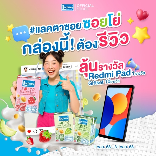 พร้อมกันนี้ แลคตาซอย ซอยโย่ ยังชวนทุกคนมาร่วมกิจกรรมลุ้นรับแท็บเล็ตสุดปัง มูลค่า 6,000 บาท เพียงแชร์โพสต์กิจกรรมและตั้งค่าเป็นสาธารณะ ถ่ายรูปดื่มแลคตาซอย ซอยโย่ รสชาติใดก็ได้ พร้อมรีวิวความอร่อยและชวนเพื่อนๆ มาดื่มโพสต์ลงโซเชียลมีเดียตั้งค่าเป็นสาธารณะติดแฮชแท็ก #LactasoySoyyo #แลคตาซอยซอยโย่ #อร่อยโย่ประโยชน์เยอะ แคปหน้าจอที่โพสต์มาคอมเมนต์ใต้กิจกรรมนี้เพื่อยืนยันสิทธิ์ ร่วมสนุกกันได้ตลอดเดือน พ.ค.68 ลุ้นรับ Redmi Pad 1 รางวัล และ Giftset Lactasoy 10 รางวัล ประกาศผลผู้โชคดีวันที่ 5 มิ.ย.68 ทาง FB: Lactasoyclub https://www.facebook.com/lactasoyclub