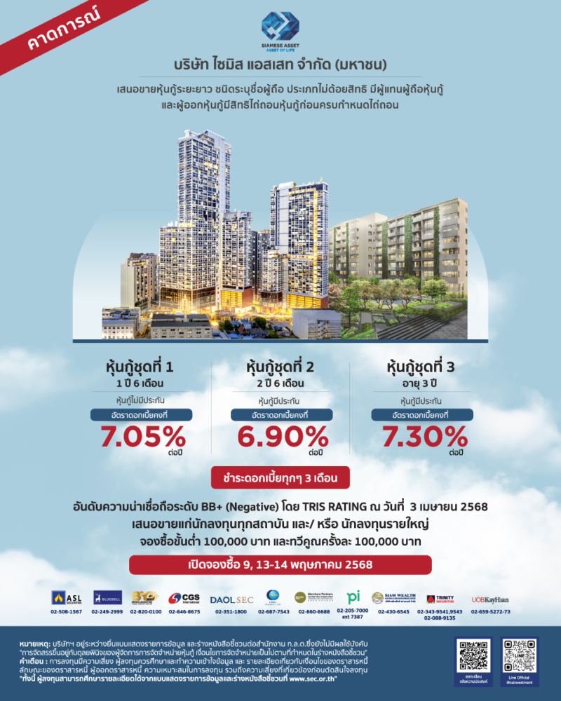 ทีมใช้เงินทำงานรับทรัพย์ทุก 3 เดือน มาทางนี้จ้า…บมจ.ไซมิส แอสเสท (SA) เตรียมเปิดขายหุ้นกู้ 3 รุ่น ดอกเบี้ยสูงสุดแตะ 7.30% ต่อปี มีทั้งแบบมีและไม่มีหลักประกันให้เลือก เปิดจอง 9, 13-14 พ.ค.นี้ เพื่อคืนหนี้ ลงทุนโครงการใหม่ และเป็นเงินทุนหมุนเวียน ฟาก “รีย์ฐิตา อักษรจิรารัตน์” ซีเอฟโอคนเก่ง มั่นใจจ่ายดอกเบี้ยตรงเวลาเหมือนที่ผ่านมา…พร้อมจุดแข็งรายได้กระจายหลากหลายจากโมเดล Branded Residence และ Mixed Use ที่สร้าง Recurring Income ได้ต่อเนื่อง อีกทั้งอสังหาฯ แนวราบก็มีให้เลือกรับเทรนด์ที่อยู่อาศัยแบบมั่นคง… มั่นใจผลงานปีนี้ยังโดดเด่น หากสนใจสามารถรับข้อมูลเพิ่มเติมได้ที่ www.siameseasset.co.th/debenture หรือ Call Center 1306
