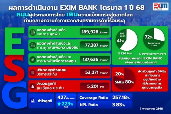 ภายใต้การกำกับดูแลกิจการที่ดี EXIM BANK ยังให้ความสำคัญกับการบริหารจัดการทางการเงินเพื่อความยั่งยืน โดย ณ สิ้นเดือนมีนาคม 2568 EXIM BANK มีสินเชื่อที่ไม่ก่อให้เกิดรายได้ (NPL) จำนวน 6,822 ล้านบาท คิดเป็น NPL Ratio ที่ 3.83% และมีค่าเผื่อผลขาดทุนด้านเครดิตที่คาดว่าจะเกิดขึ้น (Expected Credit Loss) จำนวน 17,545 ล้านบาท ซึ่งอยู่ในระดับที่แข็งแกร่ง คิดเป็นอัตราส่วนค่าเผื่อผลขาดทุนด้านเครดิตที่คาดว่าจะเกิดขึ้นต่อสินเชื่อที่ไม่ก่อให้เกิดรายได้ (Coverage Ratio) 257.18% เพิ่มเกราะป้องกันความเสี่ยงที่สูงขึ้นจากการชะลอตัวของเศรษฐกิจและปัญหาการตอบโต้ทางการค้า ส่งผลให้ EXIM BANK มีกำไรสุทธิ 427 ล้านบาท สูงกว่าที่กำหนดไว้ในแผนธุรกิจ และสูงขึ้นจากช่วงเดียวกันปีก่อนถึง 223.20%