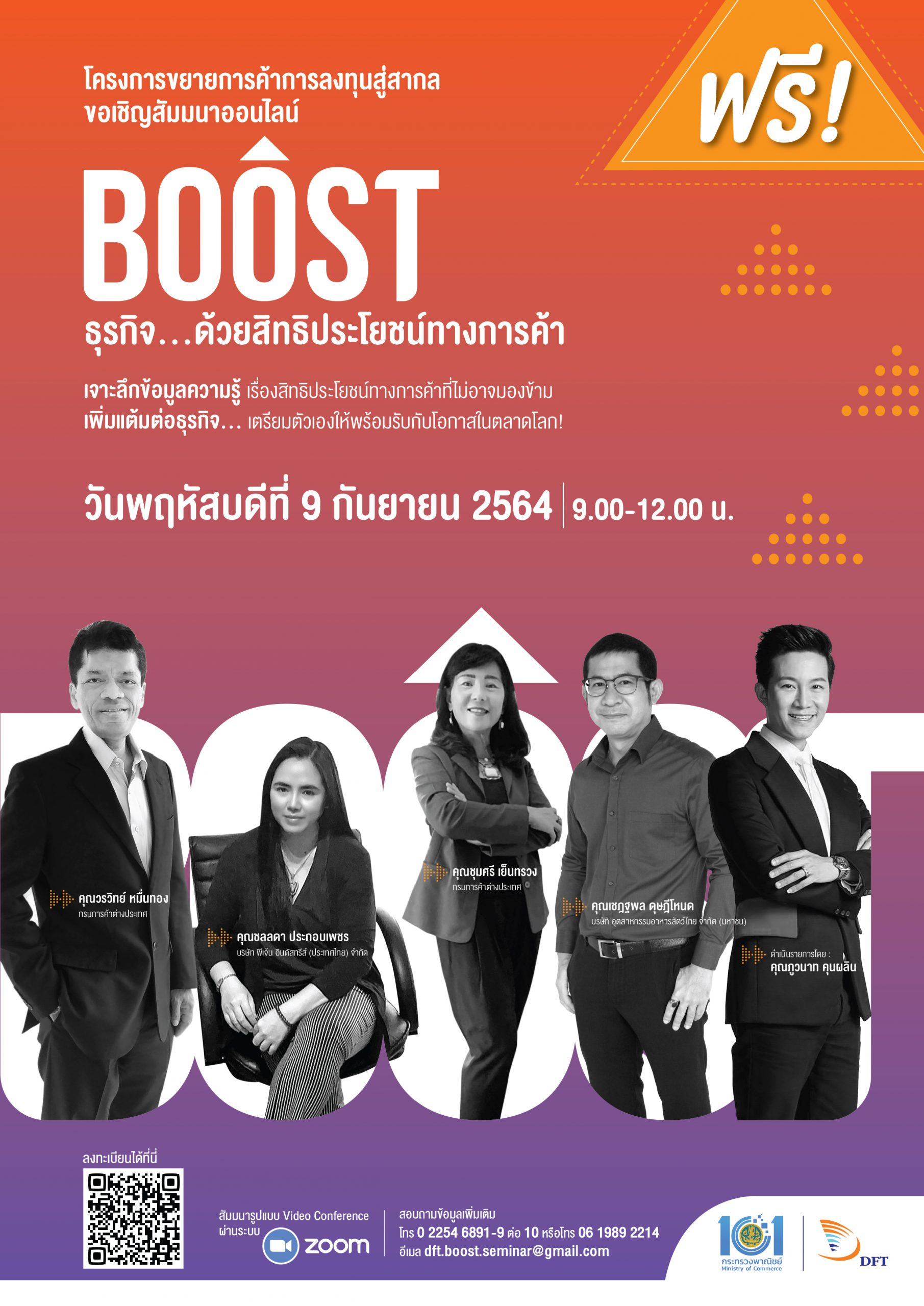 ผู้สนใจเข้าร่วมการสัมมนา สามารถลงทะเบียนฟรีผ่าน Google Forms ได้ที่ หรือ สามารถสอบถามข้อมูลเพิ่มเติมได้ที่ โทร 0 2254 6891-9 ต่อ 10 หรือโทร 06 1989 2214 อีเมล dft.boost.seminar@gmail.com