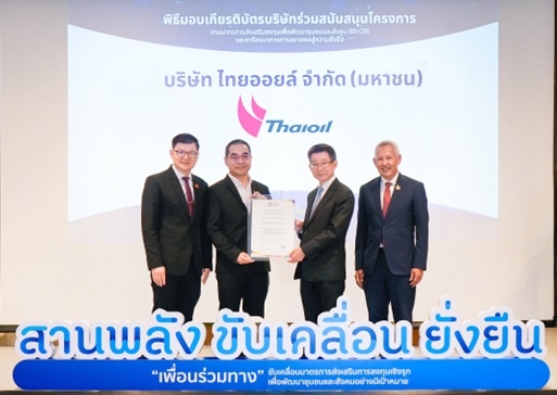 เมื่อเร็วๆ นี้ บริษัท ไทยออยล์ จำกัด (มหาชน) โดยคุณถิรยุทธ ลิมานนท์ ผู้จัดการฝ่ายกิจการสัมพันธ์ รับเกียรติบัตรจาก ดร. กอบศักดิ์ ภูตระกูล ประธานกรรมการสถาบันพัฒนาองค์กรชุมชน (พอช.) ในพิธีมอบเกียรติบัตรบริษัทร่วมสนับสนุนโครงการตามมาตรการส่งเสริมลงทุนเพื่อพัฒนาชุมชนและสังคม (BOI-CSR) ซึ่งจัดโดยสถาบันพัฒนาองค์กรชุมชน (องค์การมหาชน) (พอช.) ร่วมกับสำนักงานกองทุนสนับสนุนการสร้างเสริมสุขภาพ (สสส.) สำนักงานคณะกรรมการส่งเสริมการลงทุน (BOI) ตลาดหลักทรัพย์แห่งประเทศไทย และสำนักงานคณะกรรมการกำกับหลักทรัพย์และตลาดหลักทรัพย์ (ก.ล.ต.) เพื่อยืนยันพลังความร่วมมือจากทุกภาคส่วนในการขับเคลื่อนมาตรการส่งเสริมการลงทุนเพื่อพัฒนาชุมชนและสังคม (BOI-CSR) พิธีดังกล่าว จัดขึ้น ณ ห้องประชุม Meeting Room 110A – C ชั้น 1 ศูนย์การประชุมแห่งชาติสิริกิติ์