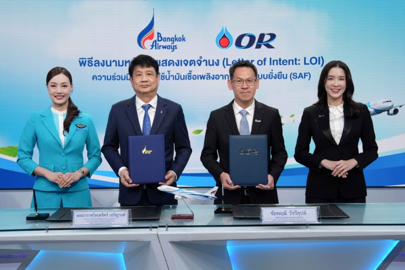 นายชัยพฤฒิ วัชรีคุปต์ ผู้จัดการฝ่ายตลาดอากาศยานและเรือขนส่ง บริษัท ปตท.น้ำมันและการค้าปลีก จำกัด (มหาชน) (OR) และนายเดชิศร์ เจริญวงศ์ รองกรรมการผู้อำนวยการใหญ่อาวุโส สายงานปฏิบัติการ / รองกรรมการผู้อำนวยการใหญ่ ฝ่ายปฏิบัติการบิน บริษัท การบินกรุงเทพ จำกัด (มหาชน) หรือ สายการบินบางกอกแอร์เวยส์ ร่วมลงนามหนังสือแสดงเจตจำนง (LOI) เรื่อง การซื้อน้ำมันเชื้อเพลิงอากาศยานแบบยั่งยืน (Sustainable Aviation Fuel: SAF) โดยผู้ผลิตภายในประเทศเป็นครั้งแรกของประเทศไทย สำหรับใช้ปฏิบัติการบินในเที่ยวบินของสายการบินบางกอกแอร์เวย์ส ณ สำนักงานใหญ่สายการบินบางกอกแอร์เวย์ส ถนนวิภาวดีรังสิต ตอบโจทย์เป้าหมายการพัฒนาอย่างยั่งยืนของทั้งสองบริษัท พร้อมผลักดันอุตสาหกรรมการบินของประเทศไทยก้าวสู่อนาคตการบินที่เป็นมิตรต่อสิ่งแวดล้อม