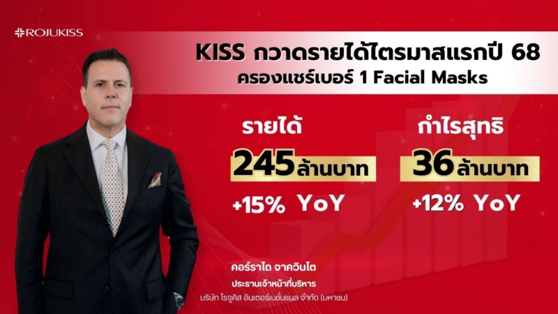 นายคอร์ราโด จาควินโต ประธานเจ้าหน้าที่บริหาร บริษัท โรจูคิส อินเตอร์เนชั่นแนล จำกัด (มหาชน) หรือ KISS เปิดเผยว่า ผลการดำเนินงานในไตรมาสแรกของปี 2568 บริษัทมีรายได้อยู่ที่ 245 ล้านบาท เพิ่มขึ้น 15% และมีกำไรสุทธิอยู่ที่ 36 ล้านบาท เพิ่มขึ้น 12% จากช่วงเดียวกันปีก่อน