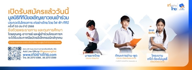 โครงการ “เท่อย่างไทย โดย ไฟ-ฟ้า ทีทีบี” กิจกรรมสังคมเพื่อมุ่งสืบสานวัฒนธรรมไทย ภายใต้มูลนิธิทีทีบี เปิดเวทีจุดประกายด้านเอกลักษณ์ไทยต่อเนื่องเป็นปีที่ 53 เพื่อส่งเสริมเยาวชนให้ร่วมใจอนุรักษ์วัฒนธรรม การสื่อสาร และการอยู่ร่วมกันในสังคม ซึ่งเป็นกิจกรรมสร้างสรรค์ที่ปลูกฝังคุณค่าความเป็นไทยและพัฒนาทักษะสำคัญสู่อนาคต ซึ่งในปี 2568 ได้จัดการประกวด 3 กิจกรรม ชิงถ้วยพระราชทานสมเด็จพระกนิษฐาธิราชเจ้า กรมสมเด็จพระเทพรัตนราชสุดา ฯ สยามบรมราชกุมารี พร้อมรางวัลทุนการศึกษา เปิดรับสมัครแล้ว! ตั้งแต่วันนี้ ถึง 8 กรกฎาคม 2568 ผ่าน www.เท่อย่างไทย.com
