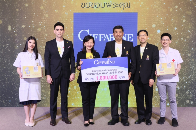 พญ.นลินี ไพบูลย์ ประธานกรรมการ บริษัท กิฟฟารีน สกายไลน์ ยูนิตี้ จำกัด ภายใต้แบรนด์ “กิฟฟารีน” แบรนด์เพื่อสุขภาพและความงามสัญชาติไทย ที่สามารถยืนหนึ่งในใจผู้บริโภคมาอย่างยาวนาน เดินหน้าตอบแทนคืนกลับสู่สังคมอย่างต่อเนื่อง ล่าสุดนำทัพผู้บริหาร คุณพงศ์พสุ อุณาพรหม รองกรรมการผู้จัดการและประธานเจ้าหน้าที่เพื่อการเติบโตองค์กร และคุณเอกกมล บุญญาภิสันท์ ผู้อำนวยการสายงานการตลาด และผู้ช่วยผู้บริหารเพื่อการเติบโตองค์กร เข้าร่วมงานแถลงข่าวเปิดตัวเข็มวันอานันทมหิดล ประจำปี พ.ศ.2568 “Air We Share, Lungs We Care : ห่วงใยทุกลมหายใจ” พร้อมมอบเงินจำนวน 1,000,000 บาท สมทบทุนโครงการเข็มวันอานันทมหิดล ประจำปี 2568 ด้วย