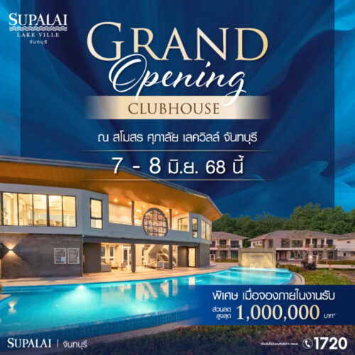 บมจ. ศุภาลัย เตรียมจัดงาน Grand Opening ศุภาลัย เลควิลล์ จันทบุรี เปิดประสบการณ์ชีวิตติดเลค กับบ้านหลังใหม่ที่คุณรอคอย กับโครงการบ้านเดี่ยวดีไซน์ทันสมัย ที่ผสานความสงบของธรรมชาติเข้ากับการใช้ชีวิตเมืองได้อย่างลงตัว ในวันที่ 7-8 มิถุนายนนี้ พิเศษเฉพาะจองภายในงาน! รับส่วนลดสูงสุด 1,000,000 บาท* เมื่อจองบ้านภายในงานเท่านั้น