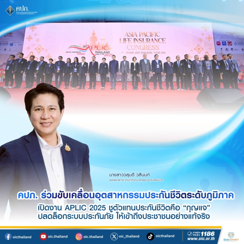 เมื่อวันที่ 27 พฤษภาคม 2568 สำนักงานคณะกรรมการกำกับและส่งเสริมการประกอบธุรกิจประกันภัย (สำนักงาน คปภ.) โดย นางสาววสุมดี วสีนนท์ รองเลขาธิการ ด้านกำกับคนกลางและประกันภัยภูมิภาค ได้ร่วมเป็นเกียรติในพิธีเปิดงาน Asia Pacific Life Insurance Congress (APLIC) ครั้งที่ 20 ณ ศูนย์การประชุมแห่งชาติสิริกิติ์ กรุงเทพมหานคร ซึ่งจัดโดย สมาคมตัวแทนประกันชีวิตและที่ปรึกษาการเงิน (THAIFA) ระหว่างวันที่ 27–29 พฤษภาคม 2568 ณ ห้อง Exhibition Hall 1–2 ชั้น G ศูนย์การประชุมแห่งชาติสิริกิติ์ จากทั่วภูมิภาคเอเชียแปซิฟิก ภายใต้แนวคิด “Create Tomorrow, Today” โดยมีผู้แทนจากภาคอุตสาหกรรมประกันชีวิตจากประเทศในภูมิภาคเอเชีย – แปซิฟิกเข้าร่วมงานกว่า 5,000 คน เพื่อแลกเปลี่ยนองค์ความรู้ แนวทางปฏิบัติที่ดี และส่งเสริมความร่วมมือในการพัฒนาธุรกิจประกันชีวิตให้เติบโตอย่างยั่งยืนและมีคุณภาพยิ่งขึ้น