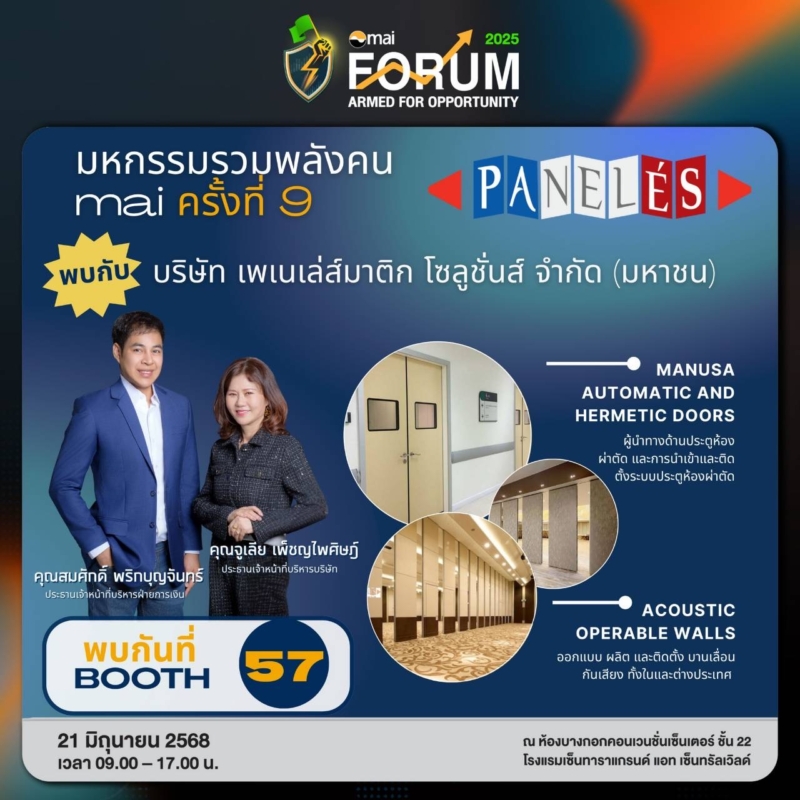 บอสหญิงสุดแกร่ง…“จูเลีย เพ็ชญไพศิษฎ์” CEO บมจ.เพเนเล่ส์มาติก โซลูชั่นส์ (PANEL) พร้อมขั้นสุด! เตรียมยกทัพจัดเต็มข้อมูลเด็ด ตอกย้ำความเป็นผู้นำด้านระบบประตูห้องผ่าตัด ประตูอัตโนมัติ ผนังบานเลื่อนกันเสียง และห้องเก็บเสียงเคลื่อนที่ รวมถึงเปิดมุมมองธุรกิจ วิสัยทัศน์การเติบโต และอัปเดตความคืบหน้าการเปิดโรงงานใหม่ ขยายกำลังผลิตกว่า 100% พบกันที่บูธ 57 ในงาน mai FORUM 2025 มหกรรมรวมพลังคน mai ครั้งที่ 9 ภายใต้แนวคิด “Armed for Opportunity ติดอาวุธ คว้าโอกาส ในตลาด mai” วันเสาร์ที่ 21 มิถุนายน 2568 เวลา 09.00-17.00 น. ณ ห้องบางกอกคอนเวนชั่นเซ็นเตอร์ ชั้น 22 โรงแรมเซ็นทาราแกรนด์ แอท เซ็นทรัลเวิลด์…โอกาสพิเศษดีๆแบบนี้ไม่ได้มีบ่อยๆ ห้ามพลาดเด็ดขาดคร้า !!