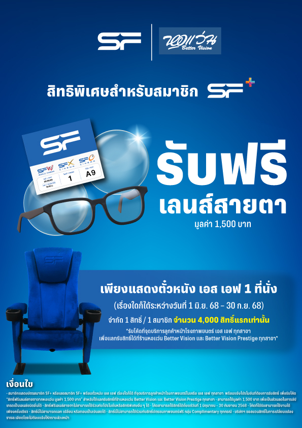 บริษัท เอส เอฟ คอร์ปอเรชั่น จำกัด (มหาชน) ร่วมกับ หอแว่น Better Vision จัดแคมเปญพิเศษให้กับลูกค้าโรงภาพยนตร์ในเครือ เอส เอฟ ที่เป็นสมาชิก SF+ เพียงแสดงบัตรสมาชิก SF+ หรือเลขสมาชิก SF+ พร้อมบัตรชมภาพยนตร์ที่โรงภาพยนตร์ในเครือ เอส เอฟ เรื่องใดก็ได้ ที่จุดบริการลูกค้าหน้าโรงภาพยนตร์ในเครือ เอส เอฟ ทุกสาขา ทั่วประเทศ พร้อมแจ้งรับสิทธิ์ เพื่อรับโค้ด “สิทธิ์ฟรีเลนส์สายตาจากหอแว่น มูลค่า 1,500 บาท” (จำกัด 1 โค้ด ต่อ 1 สมาชิก) สำหรับใช้แลกรับสิทธิ์ที่ร้านหอแว่น Better Vision และ Better Vision Prestige ทุกสาขาทั่วประเทศ ตั้งแต่วันนี้เป็นต้นไปจนถึงวันที่ 30 กันยายน 2568