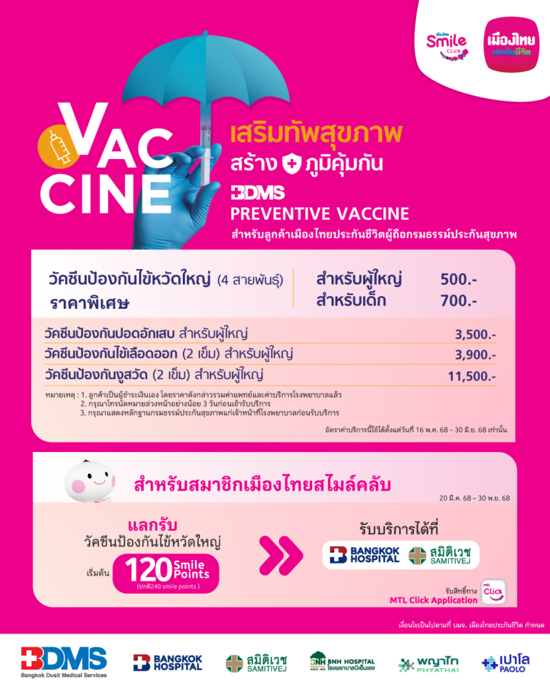 นอกจากนี้ เมืองไทยประกันชีวิตยังได้ร่วมแคมเปญ “BDMS PREVENTIVE VACCINE” มอบสิทธิพิเศษสำหรับผู้ถือกรมธรรม์ประกันสุขภาพ รับวัคซีนในราคาสุดพิเศษ (รวมค่าแพทย์) ครอบคลุม 4 กลุ่มโรคหลัก ได้แก่ วัคซีนป้องกันโรคไข้หวัดใหญ่ 4 สายพันธุ์ สำหรับผู้ใหญ่ราคา 500 บาท และเด็ก ราคา 700 บาท วัคซีนป้องกันโรคปอดอักเสบ สำหรับผู้ใหญ่ ราคา 3,500 บาท วัคซีนป้องกันโรคไข้เลือดออกสำหรับผู้ใหญ่ (2 เข็ม) รวมราคา 3,900 บาท และวัคซีนป้องกันโรคงูสวัดสำหรับผู้ใหญ่ (2 เข็ม) รวมราคา 11,500 บาท โดยผู้ถือกรมธรรม์ประกันสุขภาพของเมืองไทยประกันชีวิต สามารถแสดงหลักฐานเพื่อเข้ารับบริการได้ ณ โรงพยาบาลในเครือ BDMS ทั่วประเทศ ตั้งแต่วันที่ 16 พฤษภาคม 2568 – 30 มิถุนายน 2568 โดยผู้ที่สนใจสามารถสอบถามรายละเอียดเพิ่มเติม ได้ที่โรงพยาบาลในเครือ BDMS ทั่วประเทศ