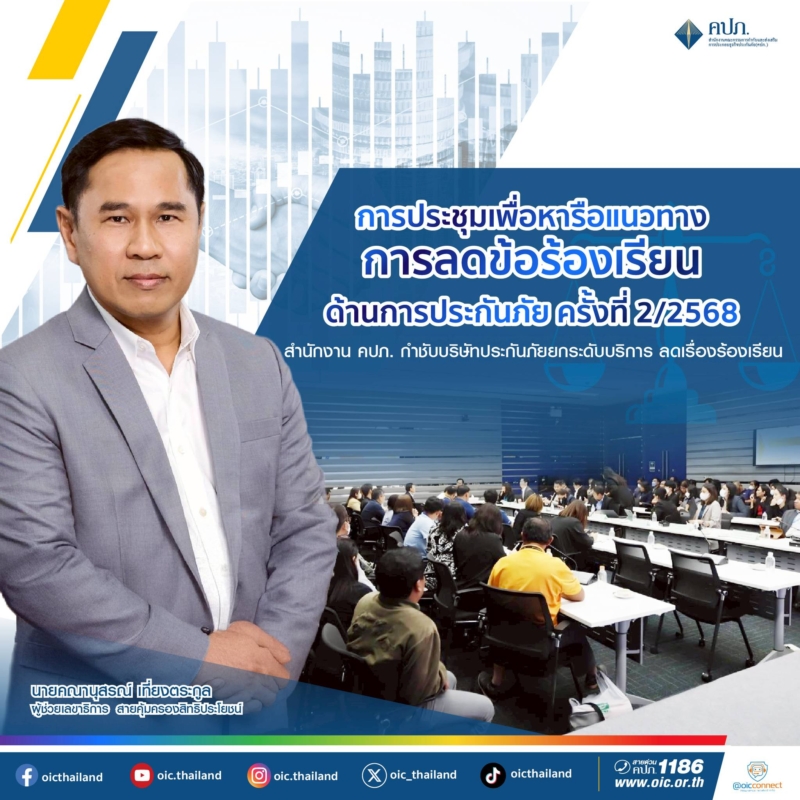 สำนักงานคณะกรรมการกำกับและส่งเสริมการประกอบธุรกิจประกันภัย (สำนักงาน คปภ.) จัดประชุมหารือแนวทางการลดข้อร้องเรียนด้านการประกันภัย ครั้งที่ 2/2568 ณ ห้องประชุมสถาบันวิทยาการประกันภัยระดับสูง ชั้น 2 สำนักงาน คปภ. ถนนรัชดาภิเษก เมื่อวันที่ 11–12 มิถุนายน 2568 โดยมีผู้แทนบริษัทประกันวินาศภัย และบริษัทประกันชีวิตทุกบริษัท เข้าร่วมประชุมรับฟังหารือแนวทางยกระดับมาตรฐานการให้บริการแก่ผู้เอาประกันภัย และผู้มีสิทธิเรียกร้องตามสัญญาประกันภัย การประชุมครั้งนี้มีเป้าหมายเพื่อลดข้อร้องเรียนและข้อพิพาท ตลอดจนส่งเสริมความโปร่งใสและความเป็นธรรมในการ คุ้มครองสิทธิของประชาชน โดยมีนายคณานุสรณ์ เที่ยงตระกูล ผู้ช่วยเลขาธิการ สายคุ้มครองสิทธิประโยชน์ เป็นประธาน การประชุม พร้อมด้วยผู้บริหารและเจ้าหน้าที่ สายคุ้มครองสิทธิประโยชน์ สายส่งเสริมและประกันภัยภูมิภาค เข้าร่วมประชุม เพื่อลดปัญหาที่เกิดขึ้น ทั้งในชั้นการพิจารณาและไกล่เกลี่ยข้อพิพาท ในชั้นพนักงานเจ้าหน้าที่ ในชั้นไกล่เกลี่ยข้อพิพาท และในชั้นผู้ชำนาญการ ซึ่งเป็นบุคคลภายนอกที่ขึ้นทะเบียนไว้ เพื่อให้บริหารจัดการข้อร้องเรียนอย่างรวดเร็ว โปร่งใส และ มีประสิทธิภาพมากยิ่งขึ้น รวมถึงการระงับข้อพิพาทด้วยวิธีอนุญาโตตุลาการที่สามารถไกล่เกลี่ยในชั้นก่อนตั้งอนุญาโตตุลาการ เพื่อลดข้อร้องเรียนให้เสร็จสิ้นโดยเร็ว