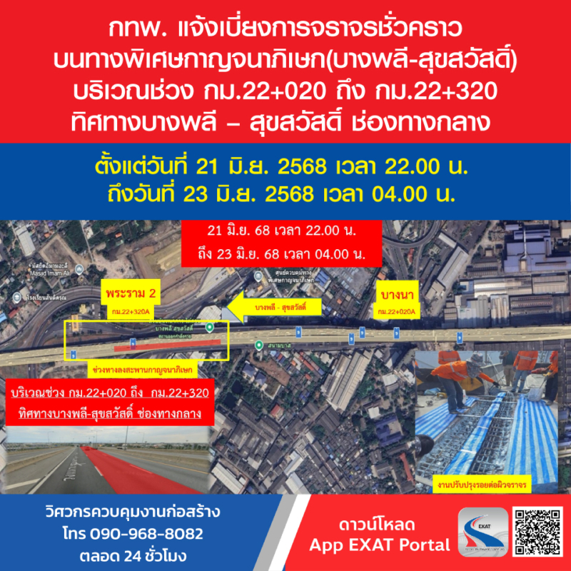 การทางพิเศษแห่งประเทศไทย (กทพ.) กระทรวงคมนาคม ได้ว่าจ้าง บริษัท ไทยวัฒน์วิศวการทาง จํากัด เป็นผู้รับจ้างดําเนินงานปรับปรุงผิวจราจรและรอยต่อทางพิเศษกาญจนาภิเษก (บางพลี – สุขสวัสดิ์) โดยผู้รับจ้าง จะเข้าดำเนินการปรับปรุงผิวจราจร และรอยต่อทางพิเศษกาญจนาภิเษก (บางพลี – สุขสวัสดิ์) จึงมีความจำเป็นจะต้องเบี่ยงการจราจรชั่วคราวบนทางพิเศษดังกล่าว บริเวณช่วง กม.22+020 ถึง กม.22+320 ทิศทางบางพลี – สุขสวัสดิ์ ช่องทางกลาง ตั้งแต่วันที่ 21 มิ.ย. 2568 เวลา 22.00 น. ถึงวันที่ 23 มิ.ย. 2568 เวลา 04.00 น.