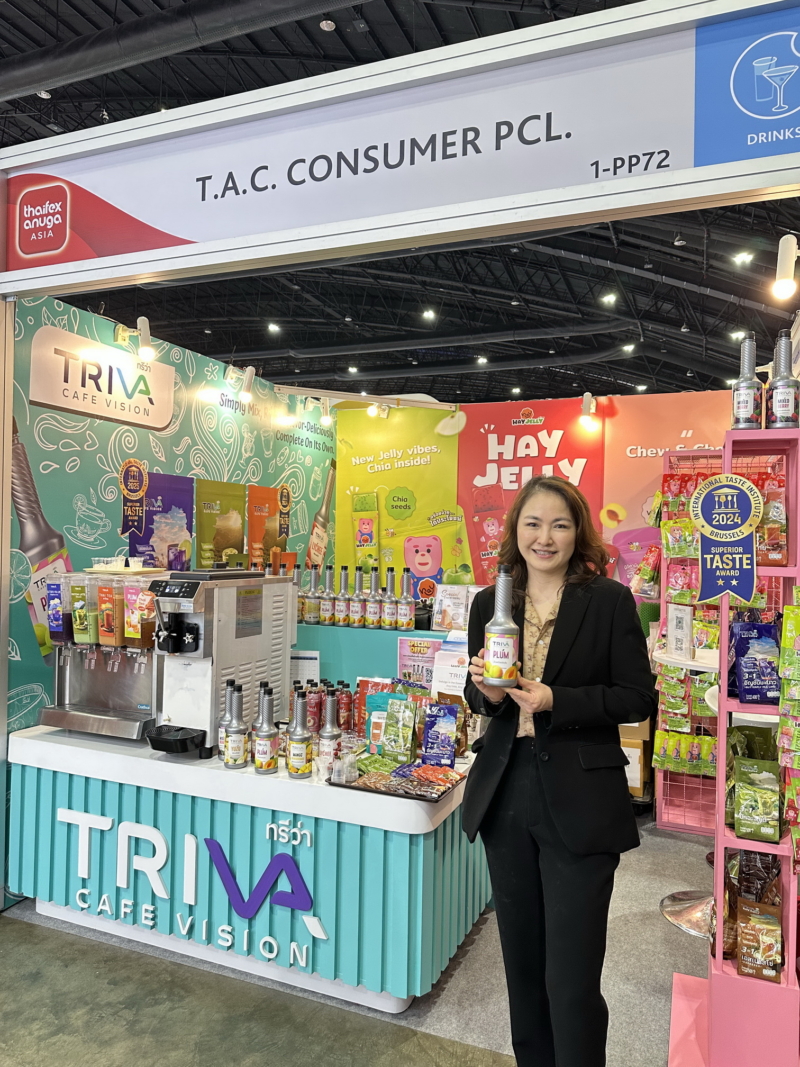 คุณภาวินี สุวรรณเมธานนท์ กรรมการผู้จัดการ บริษัท ที.เอ.ซี. คอนซูเมอร์ จำกัด (มหาชน) (TACC) นำสินค้าแบรนด์ TRIVA และ HAY Jelly ร่วมงาน THAIFEX – Anuga Asia 2025 หนึ่งในเวทีแสดงสินค้าอาหารและเครื่องดื่มที่ใหญ่ที่สุดในเอเชีย โดยภายในงานได้รับความสนใจจากผู้ประกอบการทั้งในประเทศและต่างประเทศ พร้อมเดินหน้าขยายโอกาสทางธุรกิจผ่านการหาผู้จัดจำหน่ายรายใหม่ (Distributor) เพื่อรองรับแผนการเติบโตในกลุ่มตลาดส่งออก และขยายช่องทางจำหน่ายในประเทศผ่านพาร์ทเนอร์เชิงกลยุทธ์ สำหรับไฮไลท์ของการออกบูธครั้งนี้คือ การเปิดตัวผลิตภัณฑ์ใหม่ “TRIVA ไซรัปบ๊วยเข้มข้น” ที่มีส่วนผสมของเนื้อบ๊วย และให้รสชาติที่ตอบโจทย์คาเฟ่และร้านอาหารที่ต้องการความแตกต่าง