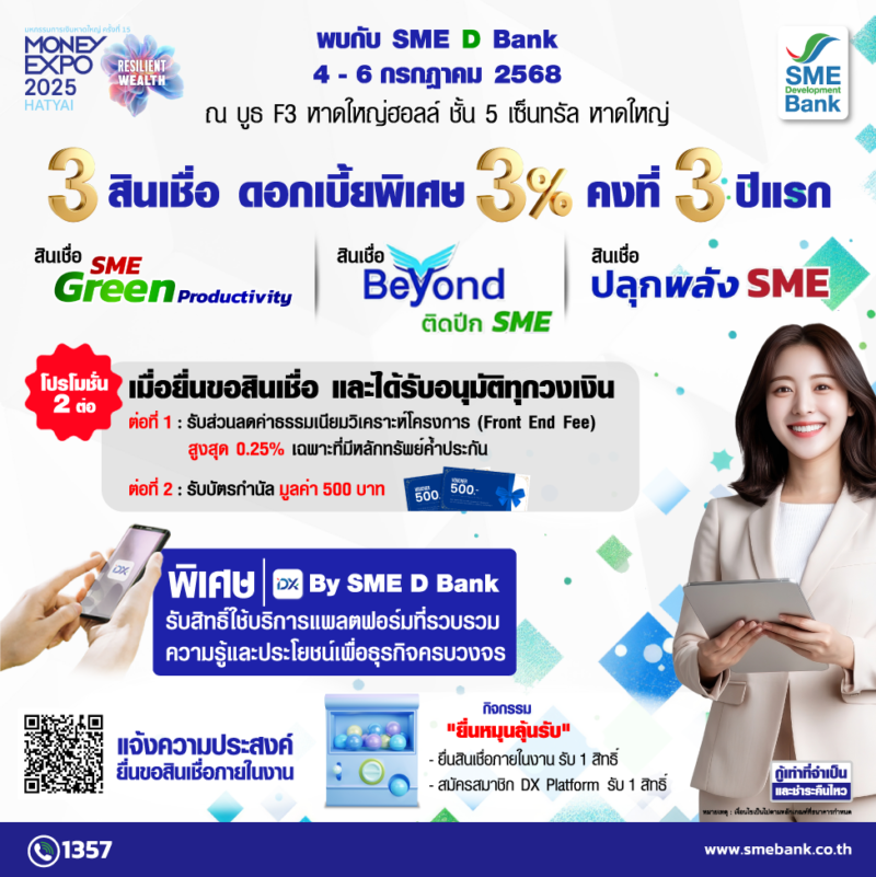 ธนาคารพัฒนาวิสาหกิจขนาดกลางและขนาดย่อมแห่งประเทศไทย (ธพว.) หรือ SME D Bank ร่วมงาน “มหกรรมการเงินหาดใหญ่” ครั้งที่ 15 (MONEY EXPO 2025 HATYAI) ระหว่างวันที่ 4-6 กรกฎาคม 2568 ณ บูธ F3 หาดใหญ่ฮอลล์ ชั้น 5 เซ็นทรัล หาดใหญ่ จ.สงขลา ยกขบวนผลิตภัณฑ์สินเชื่อครอบคลุมทุกกลุ่ม ตอบโจทย์ทุกความต้องการผู้ประกอบการเอสเอ็มอี ไฮไลท์ คือ สินเชื่ออัตราดอกเบี้ยพิเศษเพียง 3% ต่อปี คงที่ตลอด 3 ปีแรก ผ่อนชำระนานสูงสุด 10 ปี ปลอดชำระหนี้เงินต้นสูงสุด 12 เดือน วงเงินกู้สูงสุด 15 ล้านบาท ครอบคลุมทุกกลุ่มและทุกความต้องการเอสเอ็มอีไทย ควบคู่บริการพัฒนาธุรกิจ ผ่านแพลตฟอร์ม “DX by SME D Bank” (dx.smebank.co.th) ช่วยเสริมศักยภาพกิจการ ครบถ้วนในจุดเดียว ห้ามพลาด! พิเศษเฉพาะภายในงาน เมื่อยื่นขอสินเชื่อ และได้รับอนุมัติทุกวงเงิน รับโปรโมชันเสริมอีก 2 ต่อ ได้แก่ ต่อที่ 1 : ลดค่าธรรมเนียมวิเคราะห์สินเชื่อ (Front End Fee) สูงสุด 0.25% และต่อที่ 2 : รับบัตรกำนัล มูลค่า 500 บาท พร้อมเล่นเกม ลุ้นรับของที่ระลึกมากมาย สอบถามข้อมูลเพิ่มเติม Call Center 1357