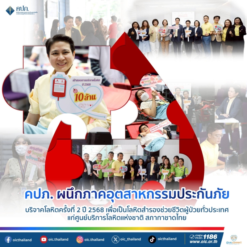 เมื่อวันที่ 23 มิถุนายน 2568 สำนักงานคณะกรรมการกำกับและส่งเสริมการประกอบธุรกิจประกันภัย (สำนักงาน คปภ.) ร่วมกับภาคอุตสาหกรรมประกันภัย จัดกิจกรรม “รวมพลังประกันภัย ให้โลหิต ปีที่ 2 ครั้งที่ 2 ประจำปี 2568” ณ ห้องประชุมชั้น 1 สถาบันวิทยาการประกันภัยระดับสูง สำนักงาน คปภ. เพื่อสนับสนุนศูนย์บริการโลหิตแห่งชาติ สภากาชาดไทย ในการจัดหา โลหิตสำรองสำหรับผู้ป่วยในโรงพยาบาลทั่วประเทศ