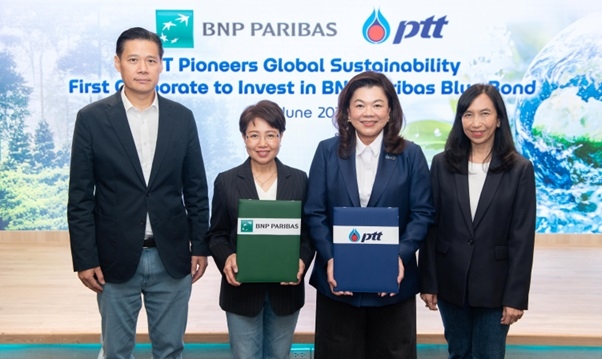 เมื่อเร็วๆ นี้ – นางสาวภัทรลดา สง่าแสง ประธานเจ้าหน้าที่บริหารการเงิน บริษัท ปตท. จำกัด (มหาชน) (ปตท.) (ที่ 2 จากขวา) พร้อมด้วย นางสมลักษณ์ ทินมณี ประธานเจ้าหน้าที่บริหาร ประจำประเทศไทย ธนาคารบีเอ็นพี พารีบาส์ (BNP Paribas) (ที่ 2 จากซ้าย) และ นายจีรุตม์ สมจินดา กรรมการผู้จัดการ BNP Paribas (ซ้ายสุด) ประกาศความสำเร็จการร่วมลงทุนระยะสั้นในตราสารหนี้เพื่อความยั่งยืน (ESG Bond) ของ BNP Paribas ประกอบด้วยตราสารหนี้สีฟ้า (Blue Bond) ซึ่ง ปตท. เป็นบริษัทแรกที่ลงทุนใน Blue Bond ของ BNP Paribas และตราสารหนี้สีเขียว (Green Bond) เป็นระยะเวลา 3 ปี ตั้งแต่ปี 2568 – 2570 มูลค่าเงินลงทุนรวมกว่า 2,700 ล้านบาท ทั้งนี้ การลงทุนในตราสารหนี้สีฟ้าจะมุ่งเน้นสนับสนุนโครงการเพื่ออนุรักษ์และฟื้นฟูทรัพยากรทางน้ำ อาทิ การขนส่งน้ำสะอาด การป้องกันมลพิษทางน้ำ การจัดการน้ำ รวมถึงการอนุรักษ์ทรัพยากรทางทะเล ซึ่งต่อยอดจากการลงทุนในตราสารหนี้สีเขียวที่มุ่งเน้นสนับสนุนโครงการที่ส่งเสริมการอนุรักษ์สิ่งแวดล้อม อาทิ โครงการเกี่ยวกับพลังงานหมุนเวียน อาคารสีเขียว รวมถึงโครงการอื่นๆ ที่เพิ่มประสิทธิภาพการใช้พลังงาน ตอกย้ำเจตนารมณ์ของ ปตท. ในการดำเนินธุรกิจที่คำนึงถึงสิ่งแวดล้อม สังคม และธรรมาภิบาล (Environmental, Social and Governance : ESG) เพื่อขับเคลื่อนเศรษฐกิจและสังคมไทยให้เติบโตอย่างยั่งยืน