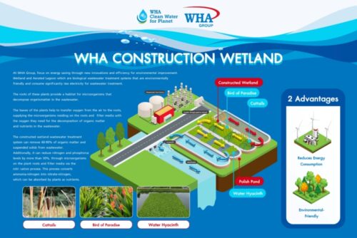 2. การบริหารจัดการน้ำอย่างครบวงจร (Water Conservation Program): สร้างระบบนิเวศน้ำที่ยั่งยืนครอบคลุมทั้งอุตสาหกรรมและชุมชน ผ่านโครงการ WHA: Clean Water for Planet ด้วยการบริหารจัดการน้ำอย่างมีประสิทธิภาพสูงสุด ตั้งแต่การจัดหาและพัฒนาแหล่งน้ำดิบเพื่อบริหารความเสี่ยงจากการขาดแคลนน้ำ การผลิตและจำหน่ายน้ำอุตสาหกรรมหลากหลายประเภท เช่น Clarified Water, Demineralized Water, Water Reclamation การบำบัดน้ำเสียและระบบการนำน้ำเสียกลับมาใช้ใหม่เพื่อผลิตน้ำคุณภาพสูงสำหรับอุตสาหกรรม ซึ่งช่วยลดการใช้น้ำจากแหล่งธรรมชาติ และลดปริมาณน้ำเสียที่ปล่อยสู่สิ่งแวดล้อม ระบบบำบัดน้ำเสียแบบบึงประดิษฐ์ ซึ่งเป็นมิตรต่อสิ่งแวดล้อม รวมไปถึงการบริหารจัดการน้ำอัจฉริยะ อาทิ การใช้ AI, IoT, SCADA, Smart Meter (OCR) เพื่อควบคุมการบริหารจัดการน้ำได้อย่างมีประสิทธิภาพ ลดปริมาณน้ำสูญเสียในระบบ (Water Loss) และลดการใช้พลังงาน ทั้งนี้ ตั้งเป้าบริหารจัดการน้ำรวม 173 ล้าน ลบ.ม. ในปี