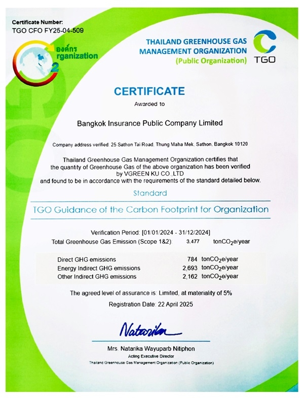 บริษัท กรุงเทพประกันภัย จำกัด (มหาชน) ได้รับประกาศนียบัตรเครื่องหมาย “คาร์บอนฟุตพริ้นท์ขององค์กร” (Carbon Footprint for Organization หรือ CFO) ในพิธีมอบประกาศนียบัตรเครื่องหมายรับรองฉลากคาร์บอน จัดโดยองค์การบริหารจัดการก๊าซเรือนกระจก (องค์การมหาชน) ณ ห้อง Conference Hall สถาบันเพื่อการยุติธรรมแห่งประเทศไทย (องค์การมหาชน) ถนนแจ้งวัฒนะ กรุงเทพฯ เมื่อวันที่ 25 มิถุนายน 2568