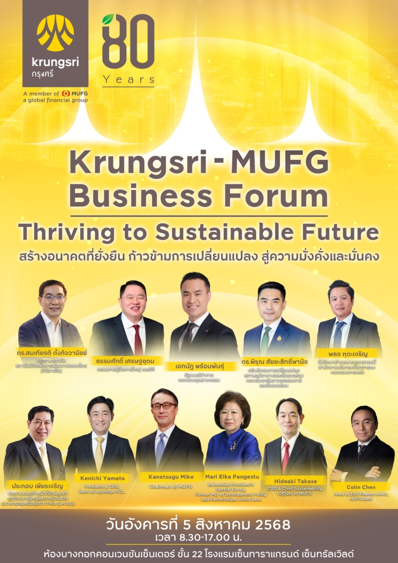 โอกาสสำคัญนี้พลาดไม่ได้! งาน Krungsri-MUFG Business Forum: Thriving to Sustainable Future จะจัดขึ้นในวันอังคารที่ 5 สิงหาคม 2568 เวลา 08.30 – 17.00 น. ณ ห้องบางกอกคอนเวนชันเซ็นเตอร์ ชั้น 22 โรงแรมเซ็นทาราแกรนด์ เซ็นทรัลเวิลด์ ผู้ที่สนใจสามารถลงทะเบียน เข้าร่วมงานสัมมนาไม่มีค่าใช้จ่าย (รับจำนวนจำกัด) ลงทะเบียนได้ตั้งแต่วันนี้ที่ https://www.zipeventapp.com/e/Krungsri—MUFG-Business-Forum-Thriving-to-Sustainable-Future