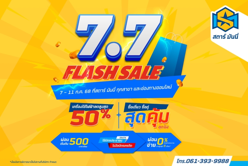 บมจ.สตาร์ มันนี่ (SM) เตรียมปลุกตลาดกลางเดือนกรกฎาคมนี้ ด้วยโปรแรง “7.7 Flash Sale” ขนทัพเครื่องใช้ไฟฟ้าแบรนด์ดังมาลดกระหน่ำสูงสุดถึง 50% แค่มีบัตรประชาชนก็เป็นเจ้าของได้ง่ายๆ ผ่อนเริ่มต้นเพียงเดือนละ 500 บาท* ระหว่างวันที่ 7–11 กรกฎาคม 2568 เท่านั้น พบกันที่ สตาร์ มันนี่ ทุกสาขา และช่องทางออนไลน์ ใครเล็งของชิ้นใหญ่ไว้ รีบเลย! ของดีมีจำนวนจำกัด ซื้อเดี่ยวก็คุ้ม ซื้อคู่ยิ่งปัง มั่นใจดันยอดขายครึ่งปีหลังพุ่งกระฉูดคร้าา!!!