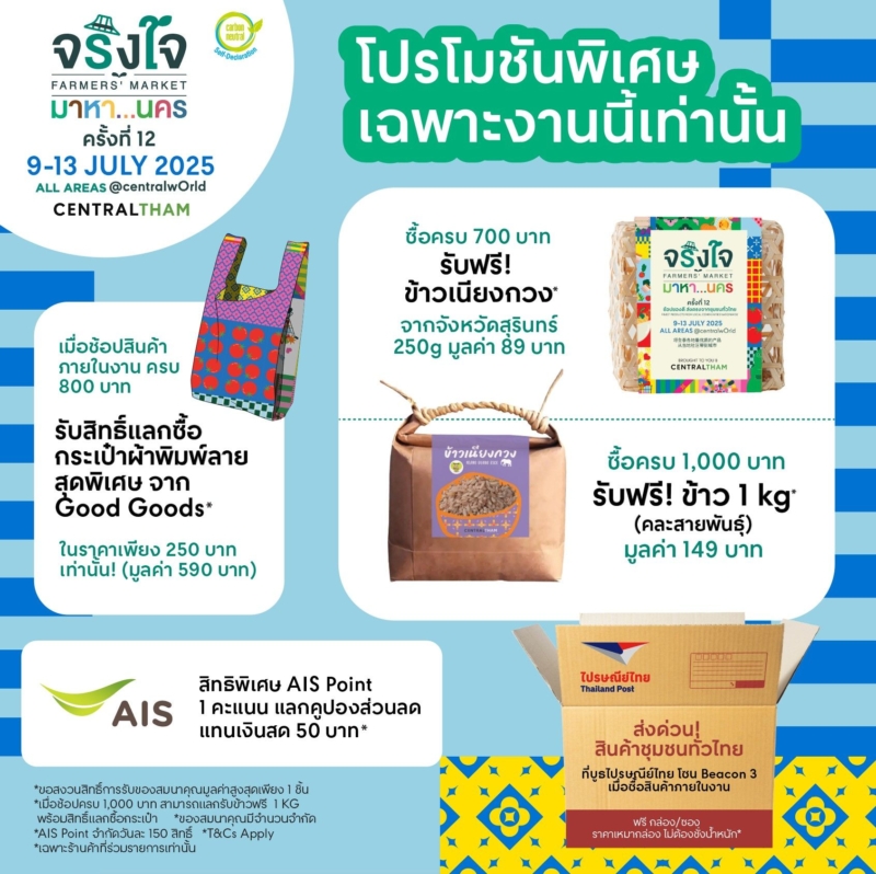 มาร่วม “ช้อป ชิม แชร์” กับมหกรรมสินค้าที่รวมผลผลิตจากความจริงใจไว้ในใจกลางกรุง “จริงใจ มาหา…นคร” ครั้งที่ 12 ระหว่างวันที่ 9–13 กรกฎาคม 2568 ณ ศูนย์การค้าเซ็นทรัลเวิลด์ ติดตามรายละเอียดเพิ่มเติมได้ที่เพจ Central Tham, CENTRAL GROUP
