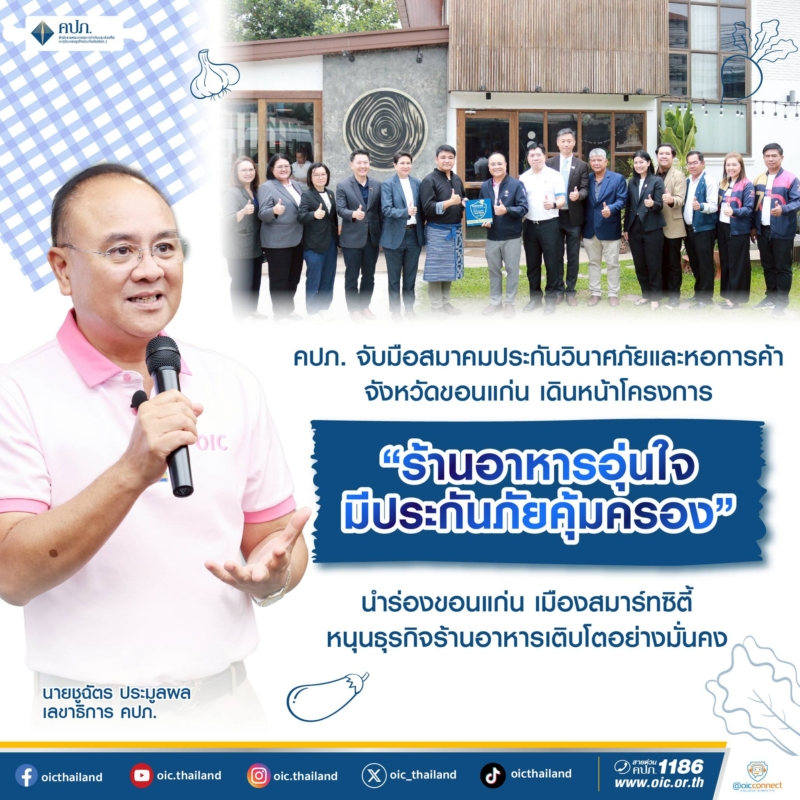 เมื่อวันที่ 2 กรกฎาคม 2568 สำนักงานคณะกรรมการกำกับและส่งเสริมการประกอบธุรกิจประกันภัย (สำนักงาน คปภ.) ร่วมกับสมาคมประกันวินาศภัยไทย และหอการค้าจังหวัดขอนแก่น เปิดตัวโครงการนำร่อง “ร้านอาหารอุ่นใจ มีประกันภัยคุ้มครอง” โดยมีนายชูฉัตร ประมูลผล เลขาธิการ คปภ. เป็นผู้มอบป้ายตราสัญลักษณ์ให้แก่ผู้ประกอบการร้านอาหารนำร่องที่มีการบริหารความเสี่ยงอย่างมีประสิทธิภาพด้วยระบบการประกันภัย รองรับการเติบโตทางเศรษฐกิจ และสร้างความมั่นใจให้กับลูกค้า ในพื้นที่จังหวัดขอนแก่น ซึ่งถือเป็นหนึ่งในจังหวัดที่มีศักยภาพทางเศรษฐกิจสูงสุดของประเทศ