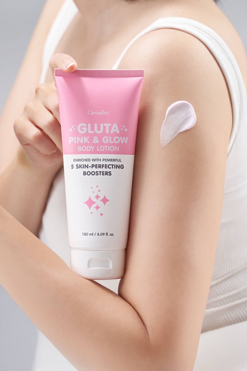 บอกลาผิวโทรม ถึงเวลาอัพผิวโกลว์ใส ปรับผิวกายให้ไบรท์มีออร่า ด้วย GIFFARINE GLUTA PINK & GLOW BODY LOTION โลชั่นบำรุงผิวกายที่อัดแน่นด้วย นวัตกรรมสารบำรุงเพื่อบูสต์ผิว 5 ชนิด (5 Skin-Perfecting Boosters) ประกอบด้วย กลูตาไธโอน (Glutathione) สารต้านอนุมูลอิสระที่ช่วยปรับผิวให้แลดูสว่างกระจ่างใส รวมถึงลดผิวหมองคล้ำจาก ทราเนซามิค แอซิด (Tranexamic Acid) พร้อมช่วยปรับผิวให้ดูสุขภาพดีมีออร่า ด้วย พาวเวอร์ฟูล วิตามิน ซี และ บี 3 (Powerful Vitamin C + B3) นอกจากนี้มี สารสกัด ชะเอมเทศ (Licorice Extract) อัพผิวโกลว์ใส รวมถึง และล็อกผิวนุ่ม ชุ่มชื้นด้วย เชียบัตเตอร์ (Shea Butter) นอกจากนี้ยังปราศจากสารที่อาจก่อให้เกิดการระคายเคือง 5 ชนิด ทั้ง Alcohol, Paraben, Formaldehyde, Methylisothiazolinone และ Mineral Oil