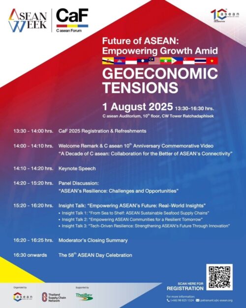 1 สิงหาคม 2568 นี้ พลาดไม่ได้กับการรวมตัวครั้งสำคัญของผู้นำระดับภูมิภาคจากหลากหลายภาคส่วน เพื่อร่วมแลกเปลี่ยนแนวคิดและกลยุทธ์ในการเตรียมความพร้อมรับมือกับอนาคตที่เปลี่ยนแปลงอย่างรวดเร็ว กับงาน C asean Forum 2025 (CaF 2025) หัวข้อ Future of ASEAN: Empowering Growth Amid Geoeconomic Tensions จัดโดยศูนย์ ซี อาเซียน (C asean) ร่วมกับ บริษัท ไทยเบฟเวอเรจ จำกัด (มหาชน) และ เครือข่ายธุรกิจห่วงโซ่อุปทานแห่งประเทศไทย (Thailand Supply Chain Network : TSCN) มีวัตถุประสงค์หลักเพื่อส่งเสริมความร่วมมือ แบ่งปัน แรงบันดาลใจ และแนวคิดที่สามารถนำไปปฏิบัติได้จริง ท่ามกลางความตึงเครียดของสถานการณ์โลก และเศรษฐกิจในปัจจุบัน