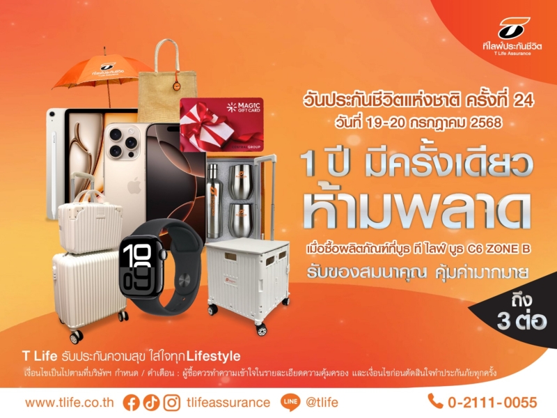 ที ไลฟ์ ประกันชีวิต บริษัทในกลุ่มธนชาต คัดสรรผลิตภัณฑ์ประกันชีวิตคุณภาพหลากหลายรูปแบบที่ตอบโจทย์ทุกไลฟ์สไตล์ครอบคลุมทุกความต้องการ พร้อมด้วยของสมนาคุณมากมาย เข้าร่วมงานวันประกันชีวิตแห่งชาติ ครั้งที่ 24 ในวันที่ 19-20 กรกฎาคม 2568 ณ ศูนย์การค้าเซ็นทรัลเวสต์เกต จังหวัดนนทบุรี ชั้น 1 โซน A, B และ C