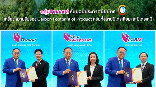 เมื่อเร็วๆ นี้ คุณภูพิงค์ ทวีทรัพย์ ผู้จัดการฝ่ายความยั่งยืนองค์กร คุณจิดาภา สุนทรารัตน์พงษ์ ผู้จัดการฝ่ายเทคโนโลยี บริษัท ไทยออยล์ จำกัด (มหาชน) และคุณเชษฐ์ โปร่งจิตต์ กรรมการอำนวยการ บริษัท ลาบิกซ์ จำกัด เป็นผู้แทนกลุ่มไทยออยล์ รับมอบประกาศนียบัตรเครื่องหมายรับรองคาร์บอนฟุต พริ้นท์ของผลิตภัณฑ์ (Carbon Footprint of Product) ของบริษัท ไทยออยล์ จำกัด (มหาชน) (TOP) บริษัท ไทยพาราไซลีน จำกัด (TPX) และบริษัท ลาบิกซ์ จำกัด (LABIX) จาก ดร.วิจารย์ สิมาฉายา ประธานกรรมการองค์การบริหารจัดการก๊าซเรือนกระจก ในพิธีมอบประกาศนียบัตรเครื่องหมายรับรองฉลากคาร์บอน ซึ่งจัดโดยองค์การบริหารจัดการก๊าซเรือนกระจก (องค์กรมหาชน) ณ สถาบันเพื่อการยุติธรรมแห่งประเทศไทย