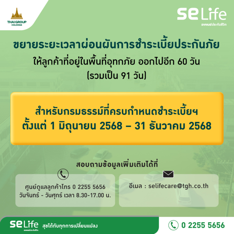SE Life อาคเนย์ประกันชีวิต ออกมาตรการช่วยลูกค้าผู้ประสบอุทกภัย ขยายระยะเวลาผ่อนผันชำระเบี้ยออกไปอีก 60 วัน รวมเป็น 91 วัน เพื่อบรรเทาผลกระทบจากสถานการณ์น้ำท่วมในพื้นที่ประสบภัยจากอิทธิพลของพายุวิภา