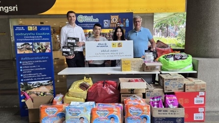 มร.โทมัส วิลสัน (ขวา) กรรมการผู้จัดการใหญ่และประธานเจ้าหน้าที่บริหาร บมจ. อลิอันซ์ อยุธยา ประกันชีวิต พร้อมด้วย มร.ลาร์ส ไฮบุทสกี้ (ซ้าย) กรรมการผู้จัดการใหญ่และประธานเจ้าหน้าที่บริหาร และ นางเกษวนา อินทราวุธ (ที่สองจากขวา) รองกรรมการผู้จัดการใหญ่ สายงานปฎิบัติการของธุรกิจ ประกันวินาศภัย บมจ. อลิอันซ์ อยุธยา ประกันภัย ร่วมกับพนักงาน ตัวแทนฝ่ายขาย และลูกค้า บริจาคสิ่งของเพื่อช่วยเหลือผู้ประสบอุทกภัยจากพายุวิภา และเหตุการณ์ความไม่สงบชายแดนไทย-กัมพูชา เช่น ชุดปฐมพยาบาล ยาสามัญ ยารักษาน้ำกัดเท้า สเปรย์กันยุง อาหารกระป๋อง อาหารพร้อมทาน อาหารสัตว์ อุปกรณ์ให้แสงสว่าง ผ้าอนามัย ผ้าอ้อมสำเร็จรูปสำหรับเด็กและผู้ใหญ่ โดย อลิอันซ์ อยุธยา ร่วมกับศูนย์แบ่งต่อ มูลนิธิกระจกเงา และทีมกู้ภัยแพทย์นอกคอก ในการส่งต่อและแจกจ่ายให้แก่ผู้ประสบภัยต่อไป