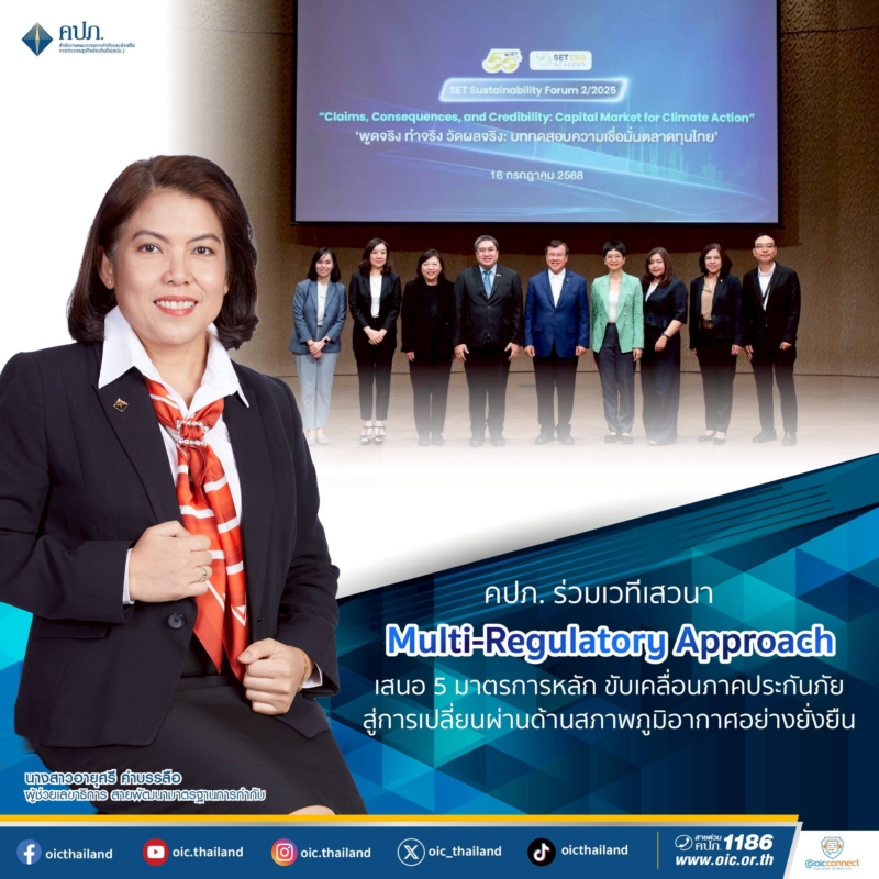 เมื่อวันที่ 16 กรกฎาคม 2568 สำนักงานคณะกรรมการกำกับและส่งเสริมการประกอบธุรกิจประกันภัย (สำนักงาน คปภ.) เข้าร่วมเสวนา หัวข้อ “Multi-Regulatory Approach : Enabling Thailand’s Climate Transition” ร่วมกับ คุณจุฬวดี วรศักดิ์โยธิน ผู้อำนวยการ ฝ่ายส่งเสริมความยั่งยืน (ผู้แทนสำนักงานคณะกรรมการกำกับหลักทรัพย์และตลาดหลักทรัพย์) คุณชนานันท์ สุภาดุลย์ ผู้อำนวยการ ฝ่ายกลยุทธ์สถาบันการเงิน (ผู้แทนธนาคารแห่งประเทศไทย) คุณนวพร วิริยนุพงศ์ ผู้อำนวยการกองนโยบายการออมและการลงทุน (ผู้แทนสำนักงานเศรษฐกิจการคลัง กระทรวงการคลัง) และคุณสุรพล บุพโกสุม ผู้อำนวยการ ฝ่ายพัฒนาบริการ ด้านความยั่งยืน (ผู้แทนตลาดหลักทรัพย์แห่งประเทศไทย)