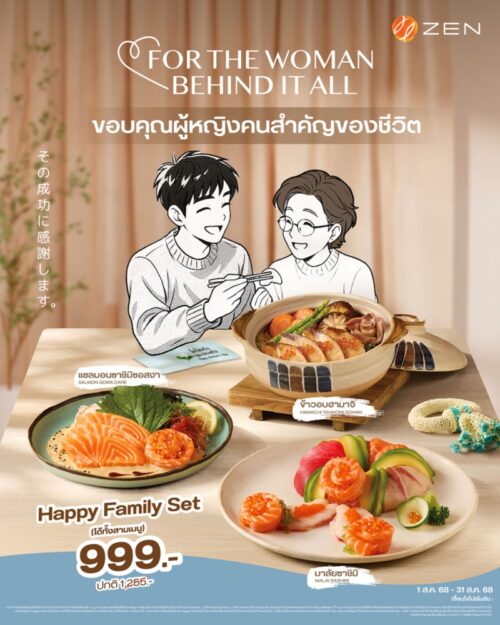 ฉลองวันแม่อย่างอบอุ่นกับเซ็ต “Happy Family Set” ราคาพิเศษเพียง 999 บาท สำหรับลูกค้าที่รับประทานแบบ A la carte ที่ร้าน ZEN ทุกสาขา ตลอดเดือนสิงหาคมนี้ (1 – 31 ส.ค. 2568) ภายในเซ็ตอัดแน่นด้วยเมนูคุณภาพ 3 รายการ ได้แก่ แซลมอนซาซิมิซอสงา, ข้าวอบปลาฮามาจิ และมาลัยซาซิมิ ให้ทุกมื้อพิเศษอิ่มอร่อยและเปี่ยมความหมาย