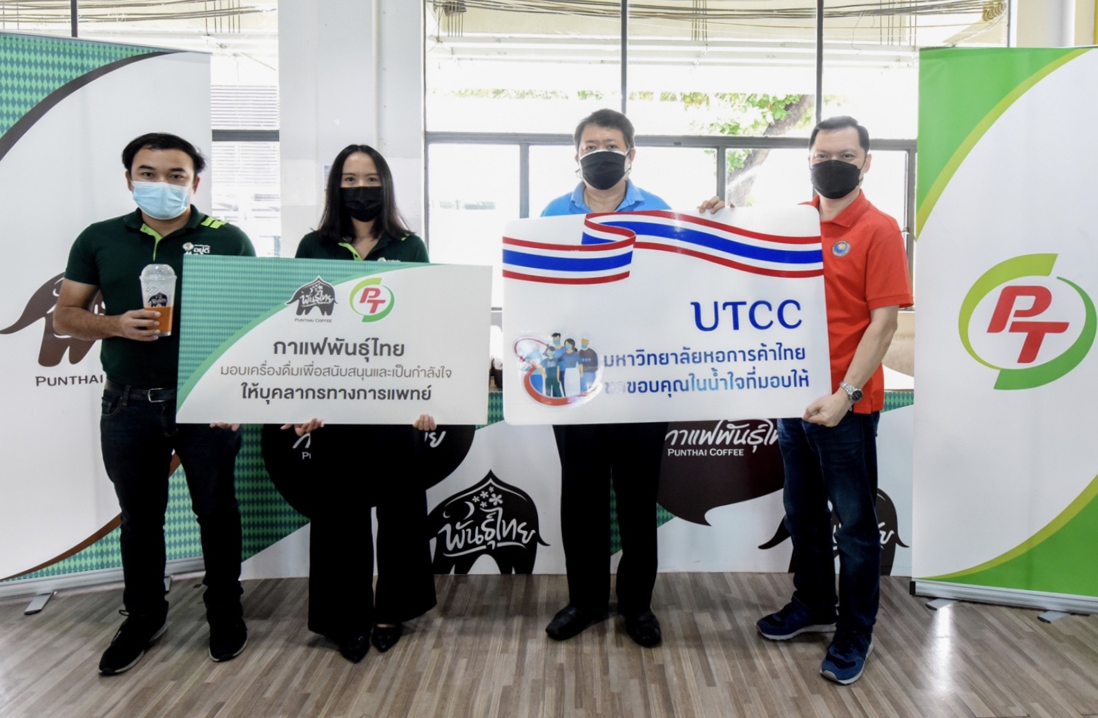 นางจิตรลดา สุระพิพิธ บริษัทกาแฟพันธุ์ไทย จำกัด บริษัทในกลุ่ม บริษัท พีทีจี เอ็นเนอยี่ จำกัด (มหาชน) หรือ PTG นำเครื่องดื่มร้อนและเย็น “กาแฟพันธุ์ไทย” มาบริการฟรีให้กับบุคลากรทางการแพทย์ เพื่อเป็นกำลังใจและขอบคุณบุคลากรทางแพทย์ ที่ปฏิบัติหน้าที่ให้บริการฉีดวัคซีนป้องกันโควิด-19 กับประชาชน โดยมี ดร.มานะ ตรีรยาภิวัฒน์ (ที่ 2 จากขวา) รองอธิการบดีฝ่ายกิจการนักศึกษา มหาวิทยาลัยหอการค้า เป็นผู้รับมอบ ณ ศูนย์บริการฉีดวัคซีน COVID-19 มหาวิทยาลัยหอการค้าไทย เมื่อเร็วๆ นี้