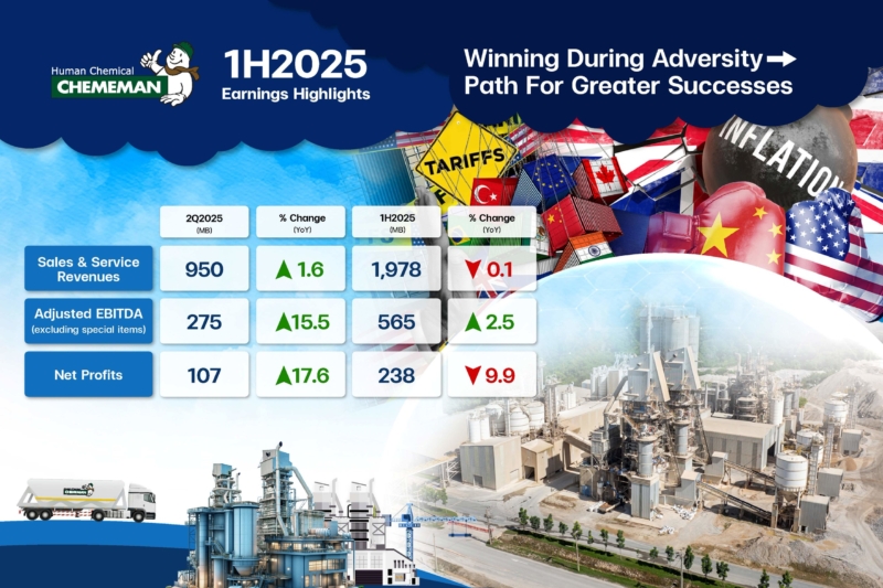 หม่อมหลวงจันทรจุฑา จันทรทัต ประธานกรรมการ บริษัท เคมีแมน จำกัด (มหาชน) (CMAN) ผู้ผลิตปูนไลม์และผลิตภัณฑ์เคมีต่อเนื่องระดับโลก ภายใต้แบรนด์ ‘CHEMEMAN’ เปิดเผยว่า ผลการดำเนินงานของบริษัทในไตรมาส 2 ปี 2568 มีรายได้จากการขายและบริการ 950 ล้านบาท เพิ่มขึ้น 1.6% กำไรสุทธิส่วนที่เป็นของผู้ถือหุ้นอยู่ที่ 107 ล้านบาท เพิ่มขึ้น 17.6% จากไตรมาสเดียวกันของปีก่อน สำหรับผลการดำเนินงานงวด 6 เดือนแรกปี 2568 บริษัทมีรายได้จากการขายและบริการ 1,978 ล้านบาท ลดลง 0.1% และกำไรสุทธิส่วนที่เป็นของผู้ถือหุ้นอยู่ที่ 238 ล้านบาท ลดลง 9.9% จากงวดเดียวกันของปีก่อน