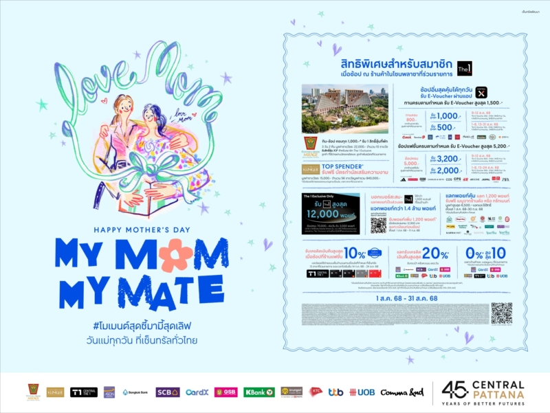 บริษัท เซ็นทรัลพัฒนา จำกัด (มหาชน) เปลี่ยนเดือนสิงหาคมให้เป็นโมเมนต์สุดซี้กับมามี้สุดเลิฟ ในแคมเปญ “My Mom, My Mate” ให้วันแม่เป็น “วันของเรา” ลุ้นแพ็กเกจที่พัก โรงแรมเซ็นทาราแกรนด์ มิราจ บีชรีสอร์ท พัทยา พร้อมจัดเต็มโปรช้อป-กิน-เที่ยวสุดคุ้มศูนย์การค้าเซ็นทรัลทั่วประเทศ