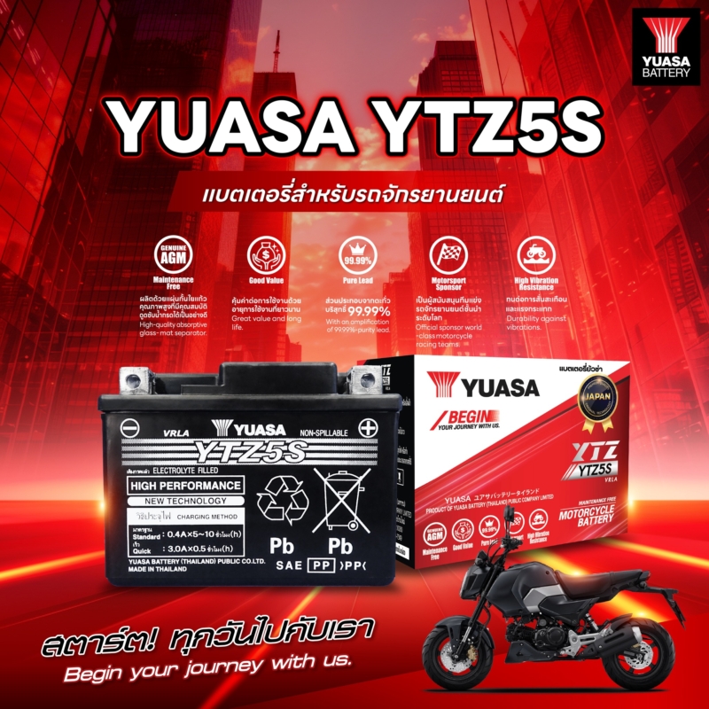 ‘ยัวซ่า’ เข้าใจว่าแต่ละวันของผู้ใช้รถมอเตอร์ไซค์เต็มไปด้วยความไม่แน่นอน จึงออกแบบแบตเตอรี่ให้พร้อมใช้งานจริง ด้วยคุณสมบัติที่ตอบโจทย์ ทั้งทนทานต่อการสตาร์ตบ่อยครั้ง เก็บประจุได้นานแม้จอดทิ้งไว้ รับมือได้กับความร้อนและความชื้นสูงของเมืองไทย ‘ยัวซ่า’จึงเป็นมากกว่าแบตเตอรี่ที่ขับเคลื่อนพลังงานของชีวิตประจำวัน พร้อมสตาร์ตไปกับคุณเสมอ สนใจแบตเตอรี่ “YUASA” คุณภาพและมาตรฐานจากประเทศญี่ปุ่น สอบถามข้อมูลสินค้าและร้านตัวแทนจำหน่าย โทร 09-9331-3337 หรือ 02-769-7300 ต่อ 7315 วันจันทร์-ศุกร์ เวลา 8:30-17:00 น.