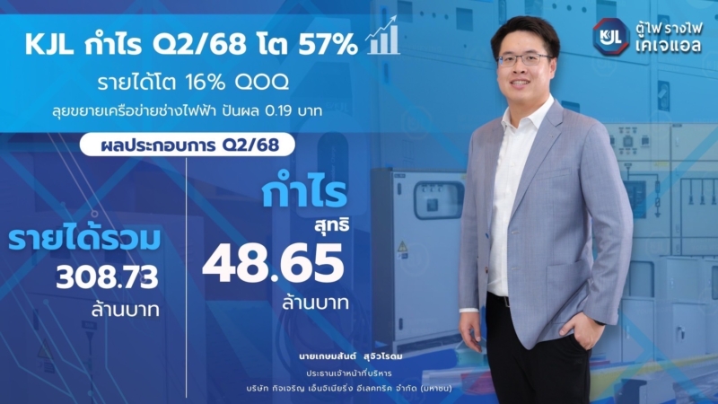นายเกษมสันต์ สุจิวโรดม ประธานเจ้าหน้าที่บริหาร บริษัท กิจเจริญ เอ็นจิเนียริ่ง อีเลคทริค จำกัด (มหาชน) หรือ KJL เปิดเผยว่า ผลประกอบการสำหรับไตรมาส 2 ปี 2568 บริษัทมีกำไรสุทธิอยู่ที่ 48.65 ล้านบาท เพิ่มขึ้น 17.72 ล้านบาท หรือคิดเป็นเพิ่มขึ้น 57.29% เมื่อเทียบกับช่วงไตรมาสก่อนหน้าที่มีกำไรสุทธิ 30.93 ล้านบาท และมีรายได้รวมอยู่ที่ 308.73 ล้านบาท เพิ่มขึ้น 43.86 ล้านบาท หรือคิดเป็นเพิ่มขึ้น 16.56% เมื่อเทียบกับไตรมาสก่อนหน้าที่มีรายได้รสม 264.87 ล้านบาท ส่งผลให้บริษัทมีกำไรสุทธิงวดครึ่งปี 2568 อยู่ที่ 79.58 ล้านบาท และมีรายได้รวมอยู่ที่ 573.60 ล้านบาท ทั้งนี้บริษัทจะจ่ายปันผลระหว่างกาลเป็นเงินสดให้ผู้ถือหุ้นในอัตรา 0.19 บาทต่อหุ้น โดยกำหนดวันที่ไม่ได้รับสิทธิปันผล หรือ XD ในวันที่ 21 ส.ค. 2568 และจ่ายปันผลในวันที่ 8 ก.ย.2568