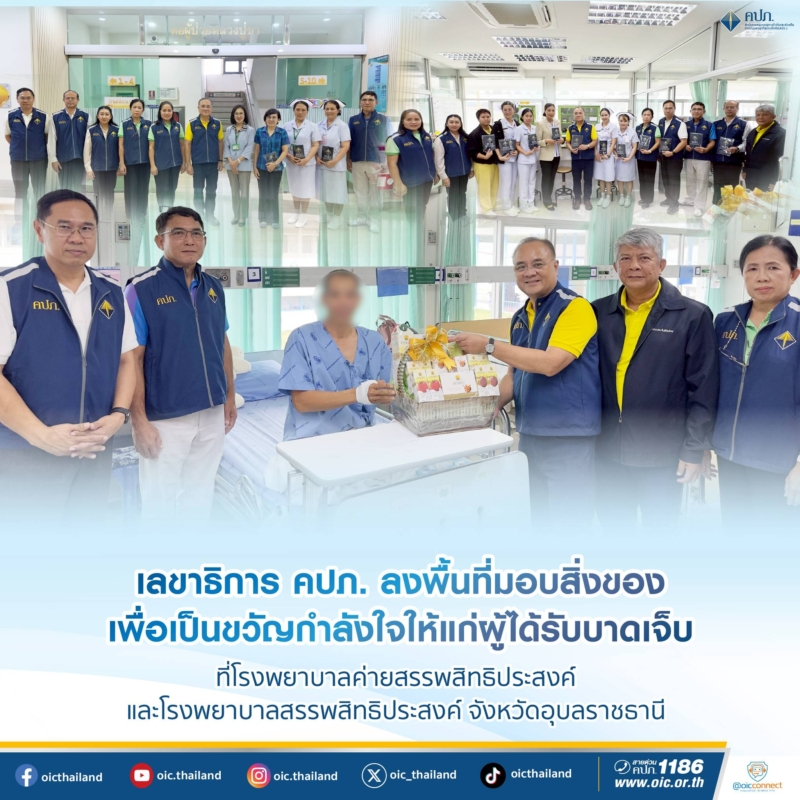 นายชูฉัตร ประมูลผล เลขาธิการคณะกรรมการกำกับและส่งเสริมการประกอบธุรกิจประกันภัย (เลขาธิการ คปภ.) พร้อมด้วย นายอาภากร ปานเลิศ รองเลขาธิการ ด้านกำกับธุรกิจประกันภัย นายคณานุสรณ์ เที่ยงตระกูล ผู้ช่วยเลขาธิการ สายคุ้มครองสิทธิประโยชน์ นางพรพยงค์ บัวศรี ผู้อำนวยการ สำนักงาน คปภ. ภาค 5 (อุบลราชธานี) และนางลฎาภา นีระมนต์ ผู้อำนวยการสำนักงาน คปภ. จังหวัดอุบลราชธานี ลงพื้นที่มอบสิ่งของเพื่อเป็นขวัญและกำลังใจให้แก่ผู้ได้รับบาดเจ็บจากสถานการณ์ความไม่สงบในพื้นที่ชายแดนไทยและกัมพูชา โดยมีเจ้าหน้าที่ผู้ปฏิบัติงาน ด้านการแพทย์และพยาบาลให้การต้อนรับ ณ โรงพยาบาลค่ายสรรพสิทธิประสงค์ และโรงพยาบาลสรรพสิทธิประสงค์ จังหวัดอุบลราชธานี