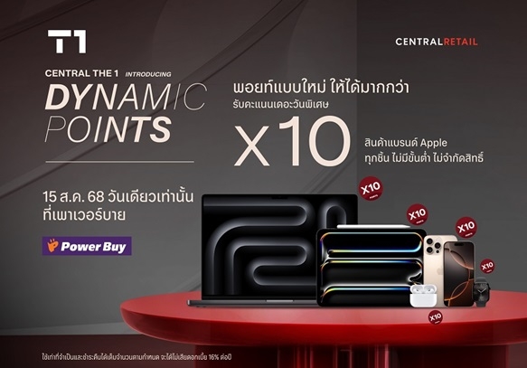 กรุงเทพฯ : บัตรเครดิต เซ็นทรัล เดอะวัน ชวนช้อปสุดคุ้มกับ “T1 Dynamic Points พอยท์แบบใหม่ ให้ได้มากกว่า” พิเศษสุด 15 สิงหาคม 2568 วันเดียวเท่านั้น รับคะแนนเดอะวันพิเศษ 10 เท่า เมื่อช้อปสินค้าแบรนด์ Apple ทุกประเภท ไม่จำกัดสิทธิ์ ที่ร้านเพาเวอร์บายสาขาที่ร่วมรายการ (จำกัดคะแนนเดอะวันพิเศษสูงสุด 24,000 คะแนนต่อหมายเลขบัตรหลัก ตลอดรายการ – เงื่อนไขเป็นไปตามที่กำหนด) ทั้งนี้ สมาชิกบัตรสามารถติดตามสินค้าที่ร่วมรายการและมอบคะแนนเดอะวันพิเศษของรายการ T1 Dynamic Points ในรอบอื่น ๆ ในทุกวันที่ 15 ของเดือน จากสื่อประชาสัมพันธ์ของบริษัท ข้อมูลเพิ่มเติมและรายละเอียด Dynamic Points ได้ที่ www.centralthe1card.com ทั้งนี้ ใช้เท่าที่จำเป็นและชำระคืนได้เต็มจำนวนตามกำหนด จะได้ไม่เสียดอกเบี้ย 16% ต่อปี